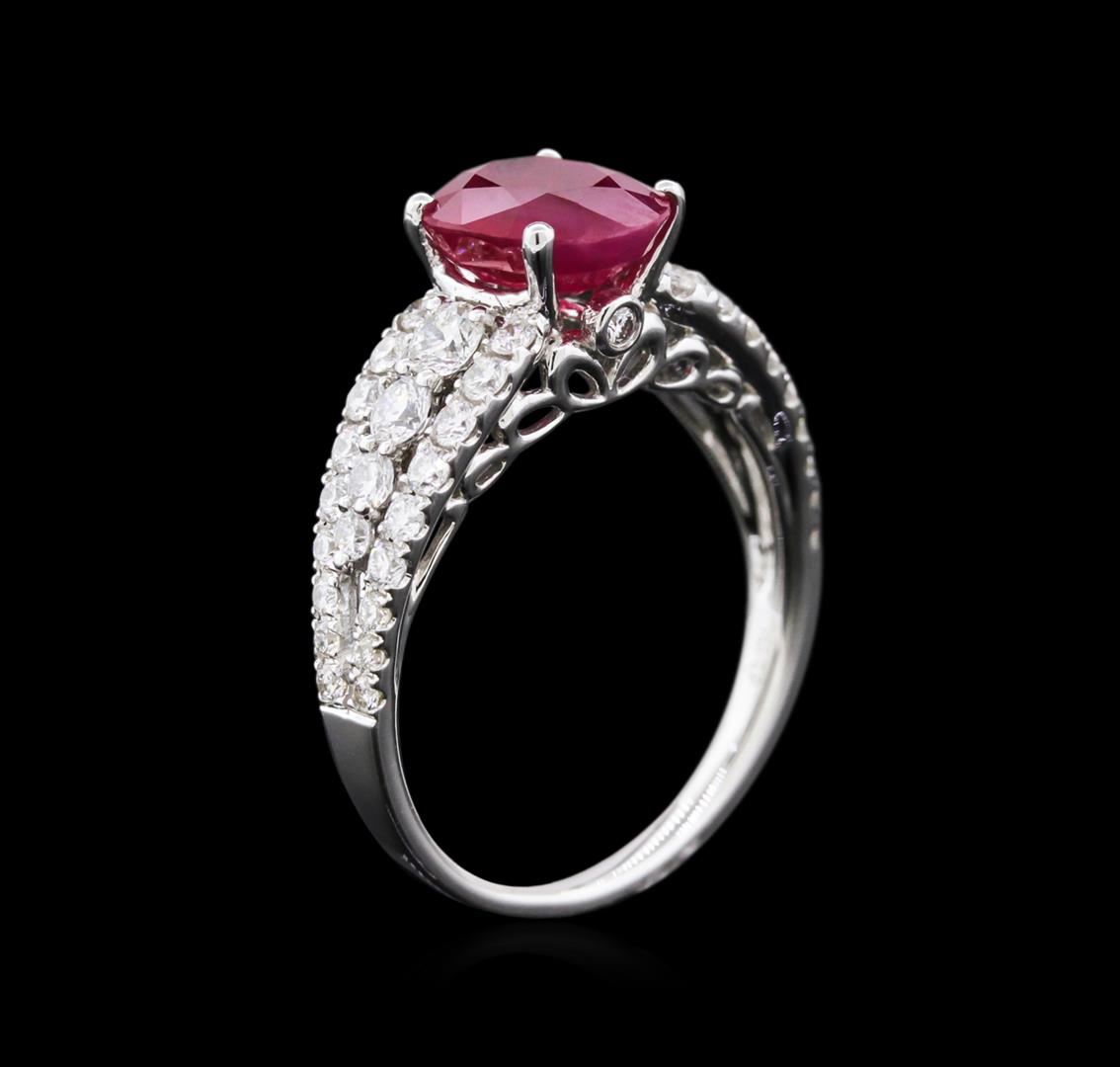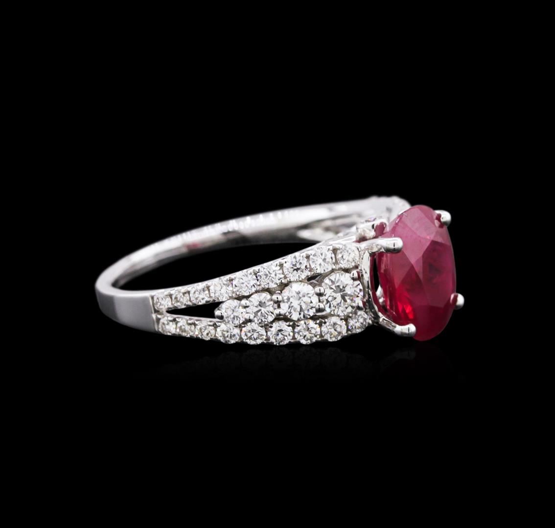 One electronically tested 18KT white gold ladies cast ruby and diamond ring with a bright polish finish. Identified with markings of "750". Condition is new. Containing: One prong set oval modified brilliant cut natural ruby, measuring 8.80 x 7.20 x 4.10mm, approximate weight of 2.21ct., clarity is heavily included, medium, moderately strong, strongly purplish red color, (GIA stpR 5/4), cut is good. Thirty-Eight prong set round brilliant cut diamonds, measuring 1.30 - 1.10 x 0.72mm (depth est.) approximate total weight of 38 Stones = 0.25ct. Clarity: SI-1 to SI-2. Color: I - J, Cut is Good. Eight prong set round brilliant cut diamonds, measuring 3.20 - 1.50 x 1.41mm (depth est.) approximate total weight of 8 Stones = 0.38ct. Clarity: SI-1 to SI-2. Color: I - J, Cut is Good. Colored gemstones are presumed to have been subjected to commonly used enhancement processes. All diamonds and colored gemstones are graded in the mounting, unless otherwise stated. Total Weight of Colored Stones 2.21ct. Total Weight of Diamonds 0.63ct. Total Weight of Ring 3.90 grams. GGL Appraised at $2,605.00.