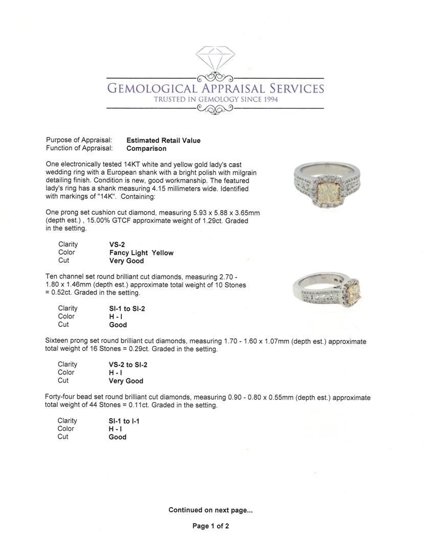One electronically tested 14KT white and yellow gold lady's cast wedding ring with a European shank with a bright polish with milgrain detailing finish. The featured lady's ring has a shank measuring 4.15 millimeters wide. Identified with markings of "14K". Condition is new, good workmanship. Containing: One prong set cushion cut diamond, measuring 5.93 x 5.88 x 3.65mm (depth est.) , 15.00.%. GTCF approximate weight of 1.29ct. Graded in the setting. Clarity: VS-2 Cut Very Good Ten channel set round brilliant cut diamonds, measuring 2.70 - 1.80 x 1.46mm (depth est.) approximate total weight of 10 Stones = 0.52ct. Graded in the setting. Clarity: SI-1 to SI-2. Color: H - I. Cut Good Sixteen prong set round brilliant cut diamonds, measuring 1.70 - 1.60 x 1.07mm (depth est.) approximate total weight of 16 Stones = 0.29ct. Graded in the setting. Clarity: VS-2 to SI-2. Color: H - I. Cut Very Good Forty-Four bead set round brilliant cut diamonds, measuring 0.90 - 0.80 x 0.55mm (depth est.) approximate total weight of 44 Stones = 0.11ct. Graded in the setting. Clarity: SI-1 to I-1. Color: H - I. Cut Good. Total Weight of Diamonds 2.21ct. Total Weight of Ring 9.00gm. GAS Appraised at $24,400.00.