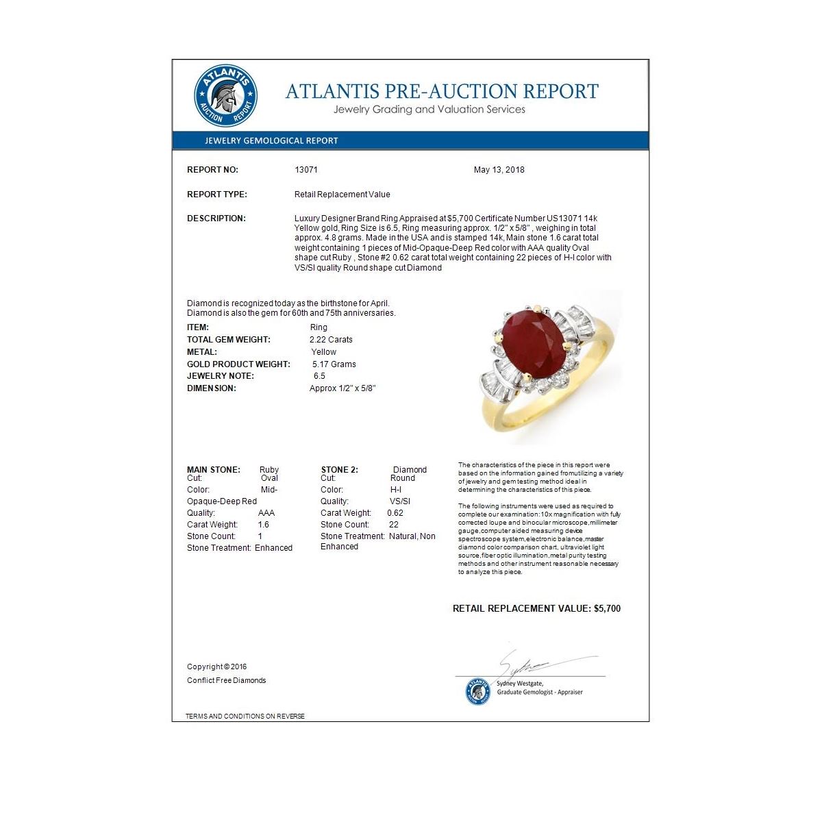 REF-80T2M -13071 ---- 2.22 CTW Ruby & Diamond Ring 14K Yellow Gold ---- Luxury Designer Brand Ring Appraised at $5,700 Certificate Number US13071 14k Yellow gold, Ring Size is 6.5, Ring measuring approx. 1/2" x 5/8" , weighing in total approx. 4.8 grams. Made in the USA and is stamped 14k, Main stone 1.6 carat total weight containing 1 pieces of Mid-Opaque-Deep Red color with AAA quality Oval shape cut Ruby , Stone #2 0.62 carat total weight containing 22 pieces of H-I color with VS/SI quality Round shape cut Diamond