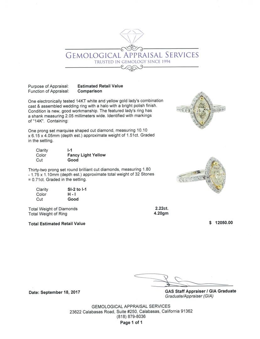 One electronically tested 14KT white and yellow gold lady's combination cast & assembled wedding ring with a halo with a bright polish finish. The featured lady's ring has a shank measuring 2.05 millimeters wide. Identified with markings of '14K'. Condition is new, good workmanship. Containing: One prong set marquise shaped cut diamond, measuring 10.10 x 6.15 x 4.05mm (depth est.) approximate weight of 1.51ct. Graded in the setting. Color Fancy Light Yellow Clarity I-1 Cut Good Thirty-Two prong set round brilliant cut diamonds, measuring 1.80 - 1.75 x 1.10mm (depth est.) approximate total weight of 32 Stones = 0.71ct. Graded in the setting. Color H - I Clarity SI-2 to I-1 Cut Good. Total Weight of Diamonds 2.22ct.. Total Weight of Ring 4.20gm GAS Appraised at $12050.00. GAS Appraised at $3,815.00.