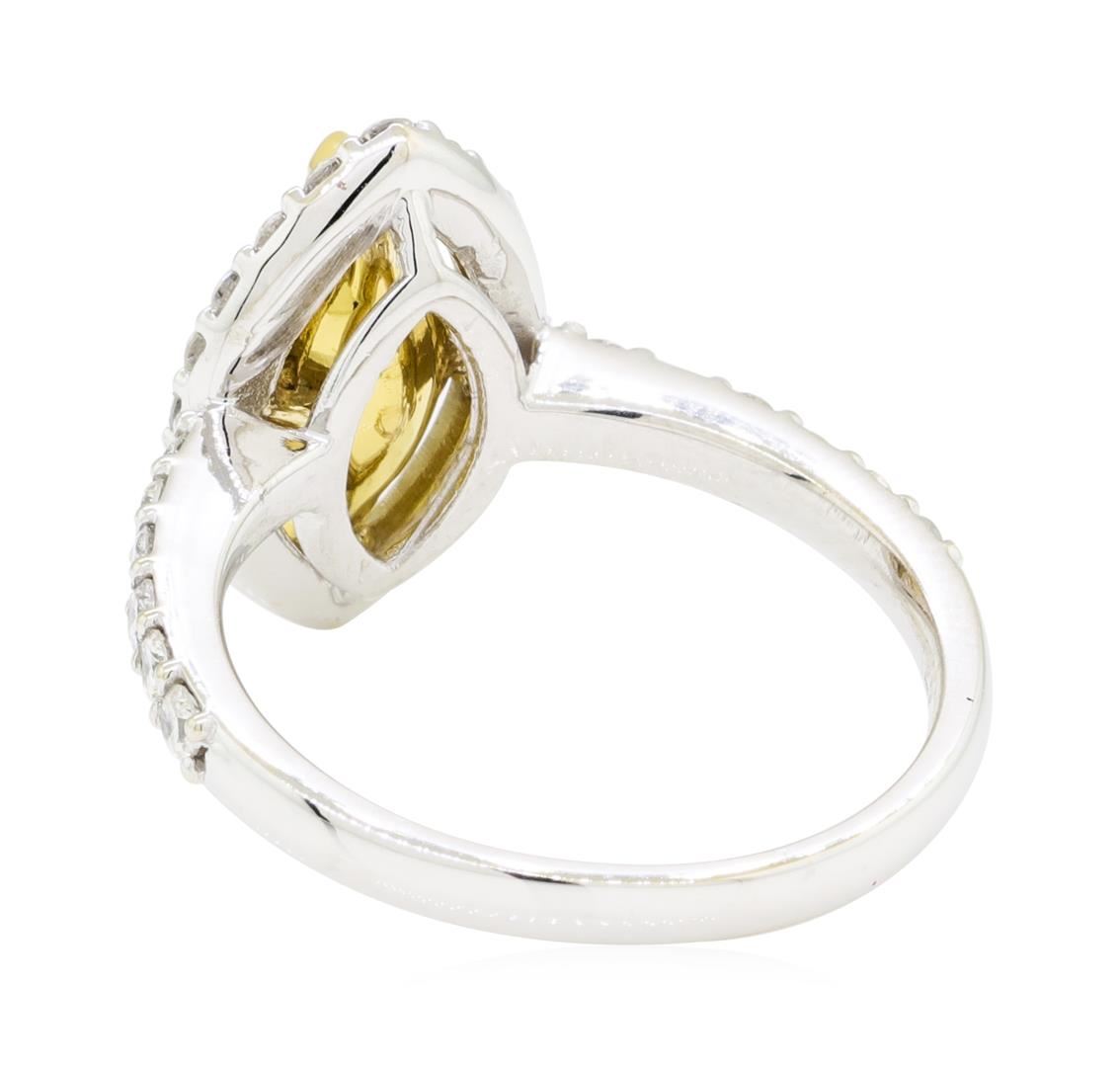 One electronically tested 14KT white and yellow gold lady's combination cast & assembled wedding ring with a halo with a bright polish finish. The featured lady's ring has a shank measuring 2.05 millimeters wide. Identified with markings of '14K'. Condition is new, good workmanship. Containing: One prong set marquise shaped cut diamond, measuring 10.10 x 6.15 x 4.05mm (depth est.) approximate weight of 1.51ct. Graded in the setting. Color Fancy Light Yellow Clarity I-1 Cut Good Thirty-Two prong set round brilliant cut diamonds, measuring 1.80 - 1.75 x 1.10mm (depth est.) approximate total weight of 32 Stones = 0.71ct. Graded in the setting. Color H - I Clarity SI-2 to I-1 Cut Good. Total Weight of Diamonds 2.22ct.. Total Weight of Ring 4.20gm GAS Appraised at $12050.00. GAS Appraised at $3,815.00.