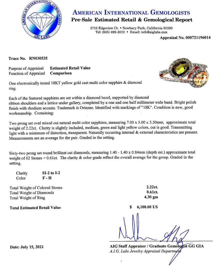 2.22ct Multi-Color Sapphire and 0.61ctw Diamond 18K Yellow Gold Ring. One electronically tested 18KT yellow gold cast multi color sapphire & diamond ring. Each of the featured sapphires are set within a diamond bezel, supported by diamond ribbon shoulders and a lattice under gallery, completed by a one and one half millimeter wide band. Bright polish finish with rhodium accents. Trademark is Orianne. Identified with markings of "I8K". Condition is new, good workmanship Two prong set oval mixed cut natural multi color sapphires, measuring 7.00 x 5.00 x 3.50mm, approximate total weight of 2.22ct. Clarity is slightly included, medium, green and light yellow colors, cut is good. Transmitting light with a minimum of distortion, transparent. Naturally occurring internal & external characteristics are present. Measurements are an average for the pair. Graded in the setting Sixty-two prong set round brilliant cut diamonds, measuring 1.40 - 1.40 x 0.84mm (depth est.) approximate total weight of 62 Stones = 0.61ct. The clarity & color grade reflect the overall average for the group. Graded in the setting Clarity SI-2 to I-2 Color F - H Total Weight of Colored Stones 2.22ct Total Weight of Diamonds 0.61ct Total Weight of Ring 430 gm
