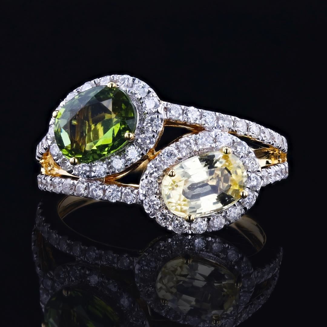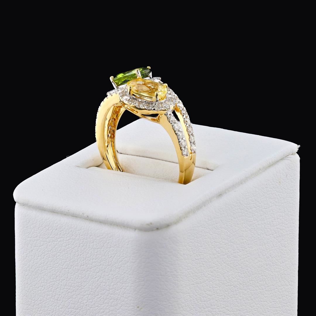 2.22ctw Multicolor Sapphires and 0.61ctw DIamond 18K Yellow Gold Ring. Please see Photos and Description for all available information. The ring is a size 6 3/4. The center stone is a 2.22ctw round cut sapphire with a color of light blue. The side stones are 62 round cut diamonds. The diamonds total weight is 0.61ct. The ring is made in 18K yellow gold. The center stone is bezel set. The side stones are prong set.