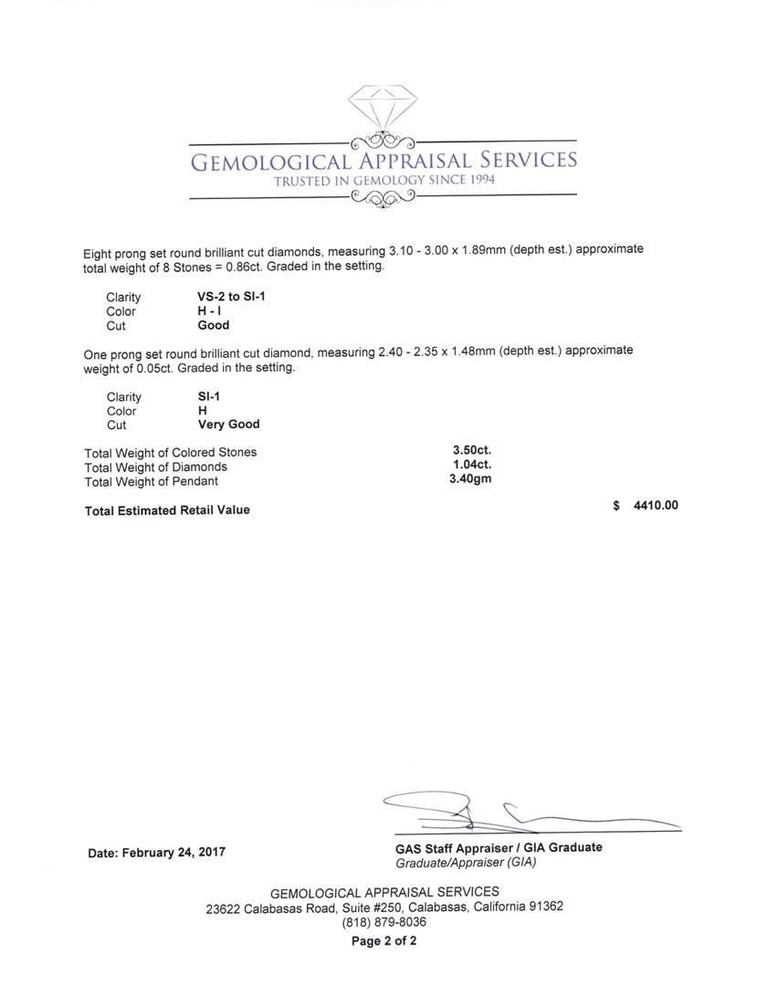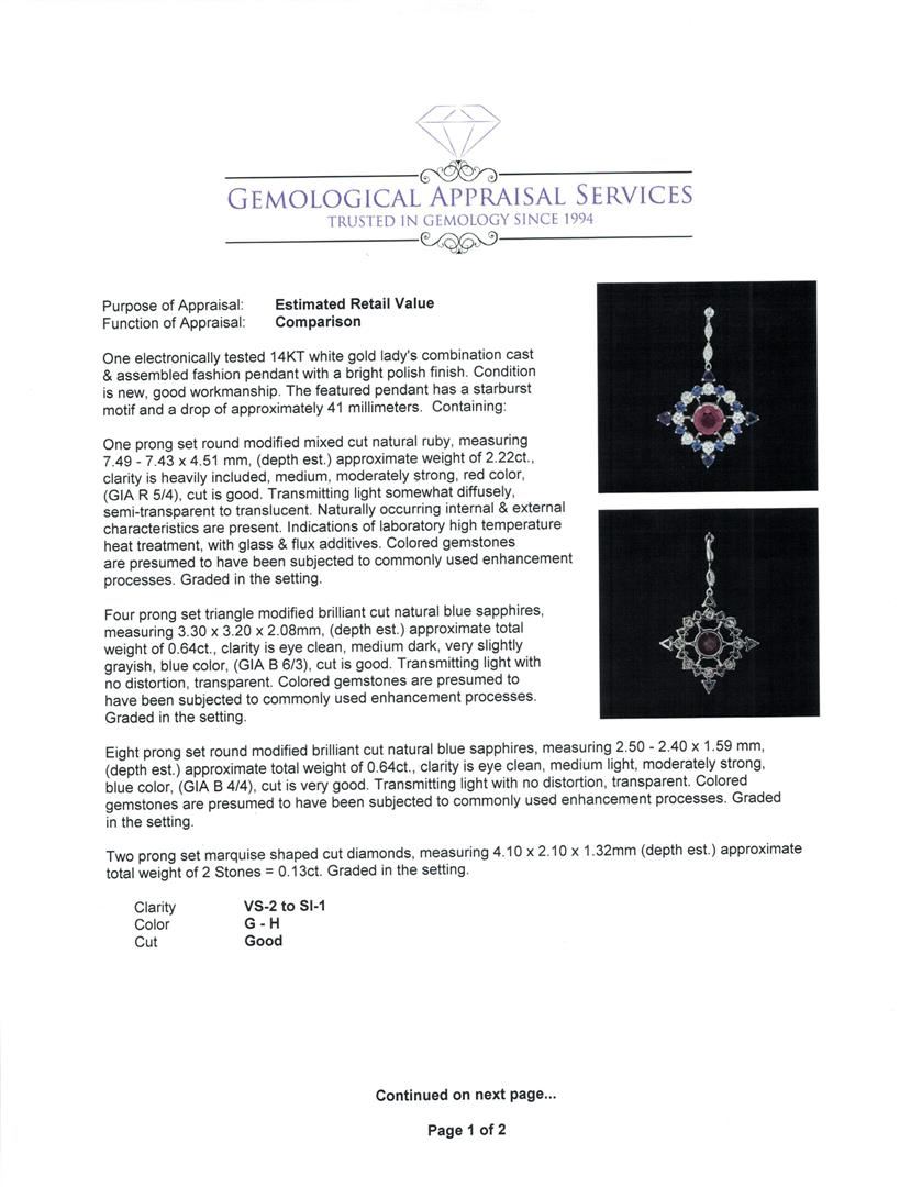 One electronically tested 14KT white gold lady's combination cast & assembled fashion pendant with a bright polish finish. The featured pendant has a starburst motif and a drop of approximately 41 millimeters. Condition is new, good workmanship. Containing: One prong set round modified mixed cut natural ruby, measuring 7.49 - 7.43 x 4.51 mm, (depth est.) approximate weight of 2.22ct., clarity is heavily included, medium, moderately strong, red color, (GIA R 5/4), cut is good. Transmitting light somewhat diffusely, semi-transparent to translucent. Naturally occurring internal & external characteristics are present. Indications of laboratory high temperature heat treatment, with glass & flux additives. Colored gemstones are presumed to have been subjected to commonly used enhancement processes. Graded in the setting. Four prong set triangle modified brilliant cut natural blue sapphires, measuring 3.30 x 3.20 x 2.08mm, (depth est.) approximate total weight of 0.64ct., clarity is eye clean, medium dark, very slightly grayish, blue color, (GIA B 6/3), cut is good. Transmitting light with no distortion, transparent. Colored gemstones are presumed to have been subjected to commonly used enhancement processes. Graded in the setting. Eight prong set round modified brilliant cut natural blue sapphires, measuring 2.50 - 2.40 x 1.59 mm, (depth est.) approximate total weight of 0.64ct., clarity is eye clean, medium light, moderately strong, blue color, (GIA B 4/4), cut is very good. Transmitting light with no distortion, transparent. Colored gemstones are presumed to have been subjected to commonly used enhancement processes. Graded in the setting. Two prong set marquise shaped cut diamonds, measuring 4.10 x 2.10 x 1.32mm (depth est.) approximate total weight of 2 Stones = 0.13ct. Graded in the setting. Color G - H Clarity VS-2 to SI-1 Cut Good Eight prong set round brilliant cut diamonds, measuring 3.10 - 3.00 x 1.89mm (depth est.) approximate total weight of 8 Stones = 0.86ct. Graded in the setting. Color H - I Clarity VS-2 to SI-1 Cut Good One prong set round brilliant cut diamond, measuring 2.40 - 2.35 x 1.48mm (depth est.) approximate weight of 0.05ct. Graded in the setting. Color H Clarity SI-1 Cut Very Good. Total Weight of Colored Stones 3.50ct.. Total Weight of Diamonds 1.04ct.. Total Weight of Pendant 3.40gm. GAS Appraised at $4,410.00.