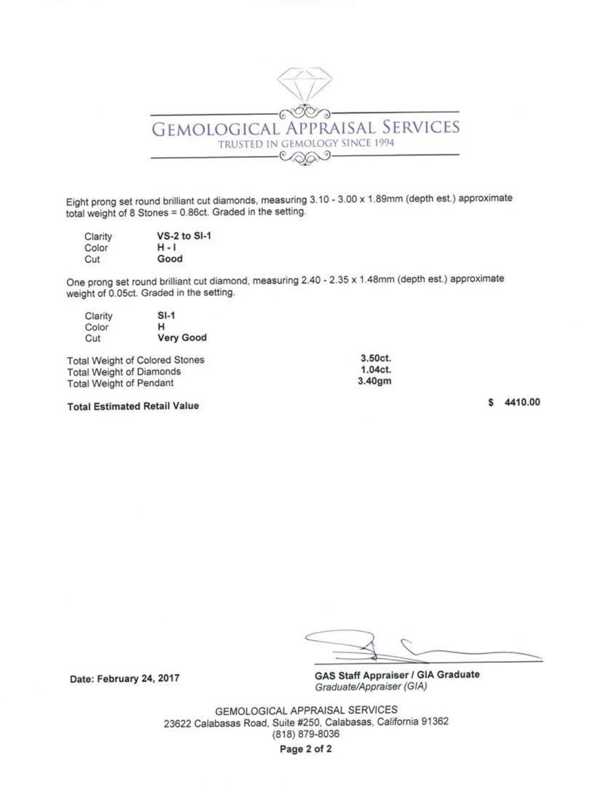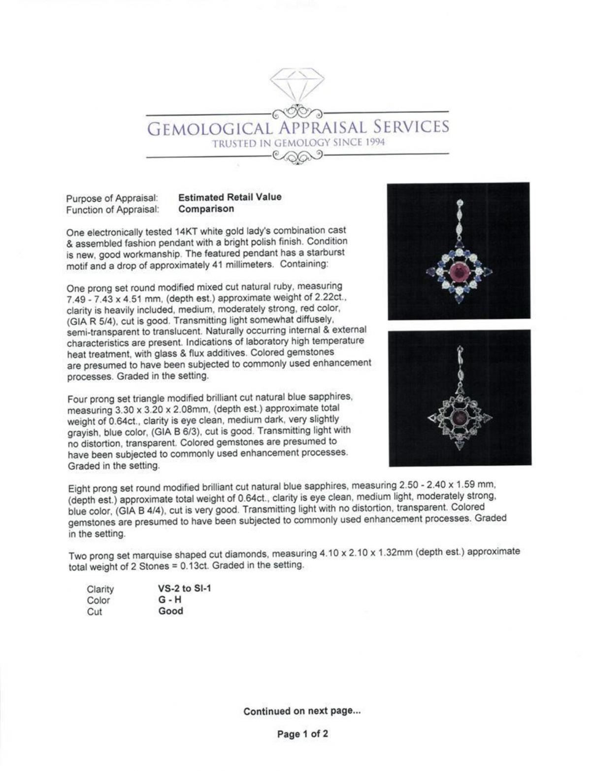One electronically tested 14KT white gold lady's combination cast & assembled fashion pendant with a bright polish finish. The featured pendant has a starburst motif and a drop of approximately 41 millimeters. Condition is new, good workmanship. Containing: One prong set round modified mixed cut natural ruby, measuring 7.49 - 7.43 x 4.51 mm, (depth est.) approximate weight of 2.22ct., clarity is heavily included, medium, moderately strong, red color, (GIA R 5/4), cut is good. Transmitting light somewhat diffusely, semi-transparent to translucent. Naturally occurring internal & external characteristics are present. Indications of laboratory high temperature heat treatment, with glass & flux additives. Colored gemstones are presumed to have been subjected to commonly used enhancement processes. Graded in the setting. Four prong set triangle modified brilliant cut natural blue sapphires, measuring 3.30 x 3.20 x 2.08mm, (depth est.) approximate total weight of 0.64ct., clarity is eye clean, medium dark, very slightly grayish, blue color, (GIA B 6/3), cut is good. Transmitting light with no distortion, transparent. Colored gemstones are presumed to have been subjected to commonly used enhancement processes. Graded in the setting. Eight prong set round modified brilliant cut natural blue sapphires, measuring 2.50 - 2.40 x 1.59 mm, (depth est.) approximate total weight of 0.64ct., clarity is eye clean, medium light, moderately strong, blue color, (GIA B 4/4), cut is very good. Transmitting light with no distortion, transparent. Colored gemstones are presumed to have been subjected to commonly used enhancement processes. Graded in the setting. Two prong set marquise shaped cut diamonds, measuring 4.10 x 2.10 x 1.32mm (depth est.) approximate total weight of 2 Stones = 0.13ct. Graded in the setting. Color G - H Clarity VS-2 to SI-1 Cut Good Eight prong set round brilliant cut diamonds, measuring 3.10 - 3.00 x 1.89mm (depth est.) approximate total weight of 8 Stones = 0.86ct. Graded in the setting. Color H - I Clarity VS-2 to SI-1 Cut Good One prong set round brilliant cut diamond, measuring 2.40 - 2.35 x 1.48mm (depth est.) approximate weight of 0.05ct. Graded in the setting. Color H Clarity SI-1 Cut Very Good. Total Weight of Colored Stones 3.50ct.. Total Weight of Diamonds 1.04ct.. Total Weight of Pendant 3.40gm. GAS Appraised.