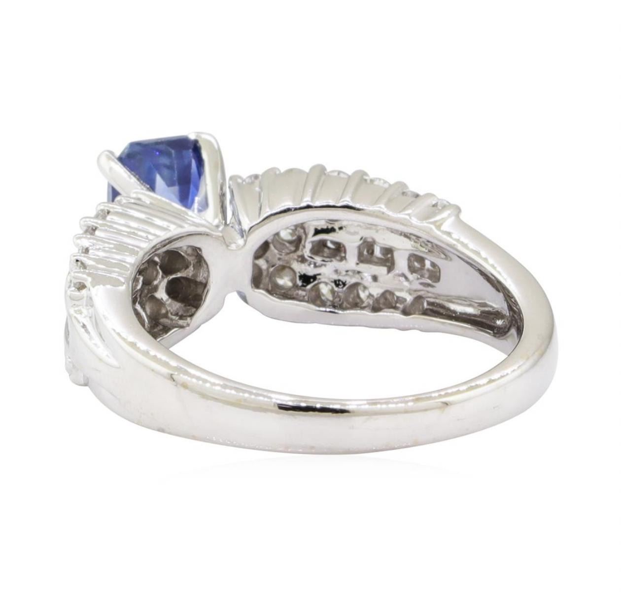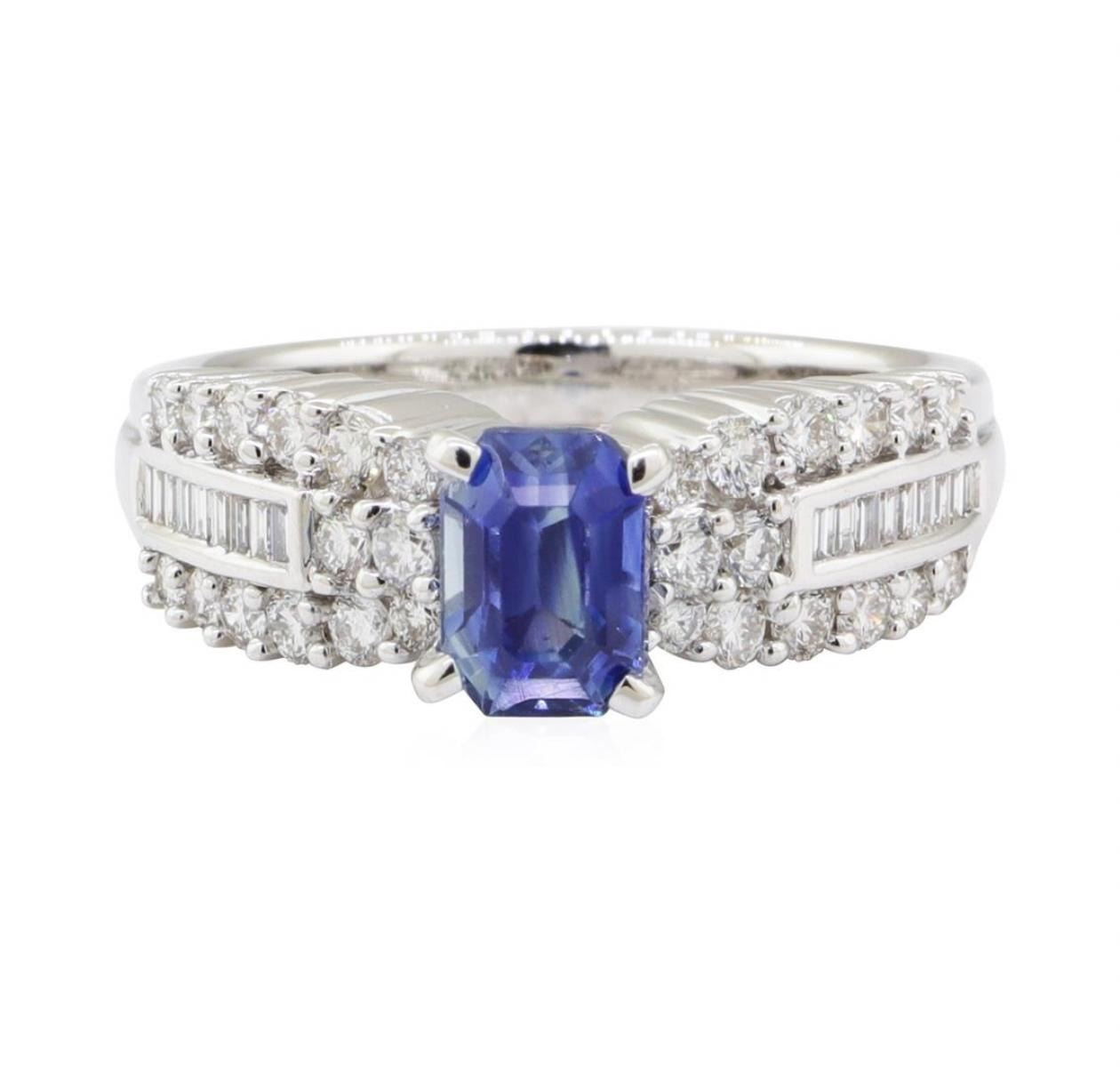 One electronically tested 18KT white gold lady's combination cast & assembled fashion ring with a pinched cathedral shank with a bright polish finish. The featured lady's ring has a shank measuring 2.50 millimeters wide. Identified with markings of '18K 750'. Condition is new, good workmanship. Containing: One prong set emerald standard step cut natural blue sapphire, measuring 6.88 x 4.96 x 4.30mm, (depth est.) approximate weight of 1.42ct., clarity is eye clean, medium, moderately strong, blue color, (GIA B 5/4), cut is very good. Transmitting light with no distortion, transparent. Colored gemstones are presumed to have been subjected to commonly used enhancement processes. Graded in the setting. Twenty-Eight prong set round brilliant cut diamonds, measuring 1.90 - 1.65 x 1.10mm (depth est.) approximate total weight of 28 Stones = 0.60ct. Graded in the setting. Color G - H Clarity VS-2 to SI-1 Cut Very Good Eighteen channel set baguette cut diamonds, measuring from 1.45 x 0.90 x 0.77mm (depth est.) to 1.50 x 1.00 x 0.85mm (depth est.) approximate total weight of 18 Stones = 0.20ct. Graded in the setting. Color G - H Clarity VS-1 to VS-2 Cut Very Good. Total Weight of Colored Stones 1.42ct.. Total Weight of Diamonds 0.80ct.. Total Weight of Ring 7.10gm GAS Appraised at $6775.00. GAS Appraised.