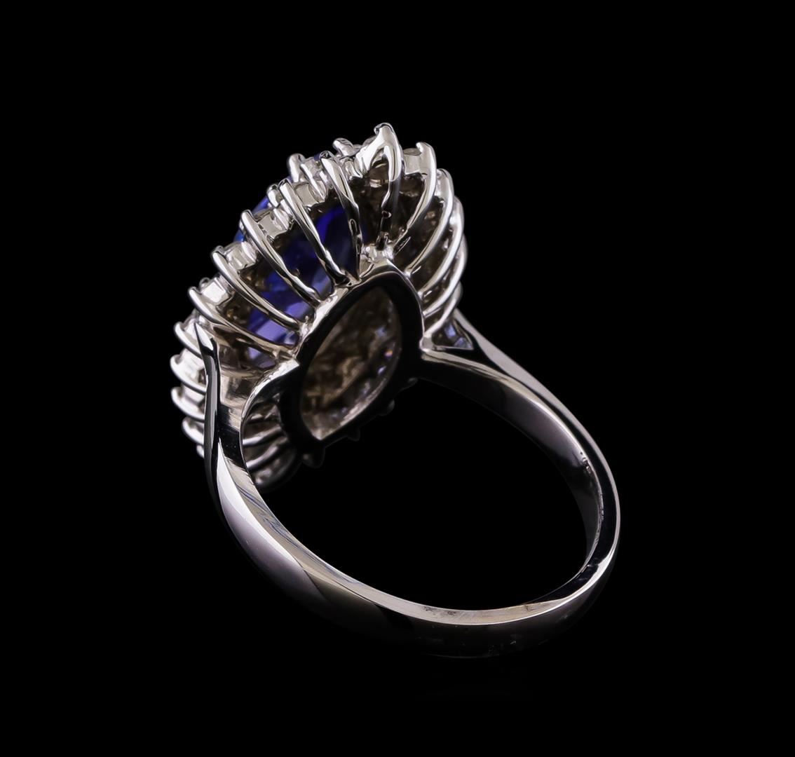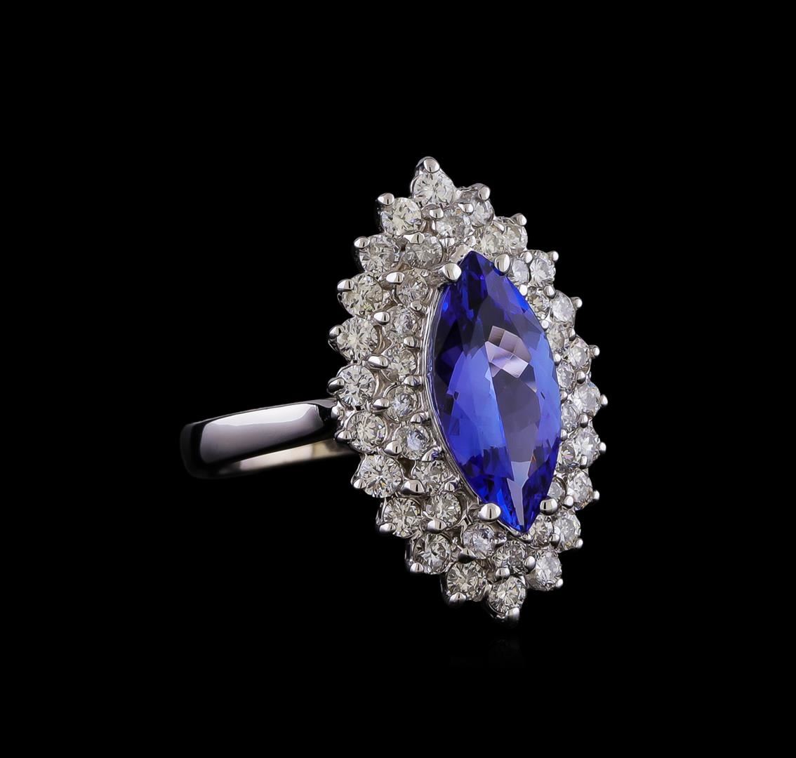 One electronically tested 14KT white gold lady's cast fashion ring with a double basket halo with a bright polish finish. The featured lady's has a shank measuring 2.50 millimeters in width. Identified with markings of "K14". Condition is new, good workmanship. Containing: One prong set marquise modified brilliant cut natural tanzanite, measuring 14.00 x 6.57 x 3.90mm, (depth est.) approximate weight of 2.22ct., clarity is eye clean, medium, moderately strong, bluish violet color, (GIA bV 5/4), cut is very good. Transmitting light with no distortion, transparent. Colored gemstones are presumed to have been subjected to commonly used enhancement processes. Graded in the setting. Twenty-Two prong set round brilliant cut diamonds, measuring 2.10 - 2.00 x 1.27mm (depth est.) approximate total weight of 22 Stones = 0.70ct. Graded in the setting. Clarity: SI-1 to SI-2. Color: G - Good Twenty prong set round brilliant cut diamonds, measuring 1.80 - 1.75 x 1.10mm (depth est.) approximate total weight of 20 Stones = 0.45ct. Graded in the setting. Clarity: SI-1 to SI-2. Color: G - Good. Total Weight of Colored Stones 2.22ct. Total Weight of Diamonds 1.15ct. Total Weight of Ring 5.80gm. GAS Appraised.