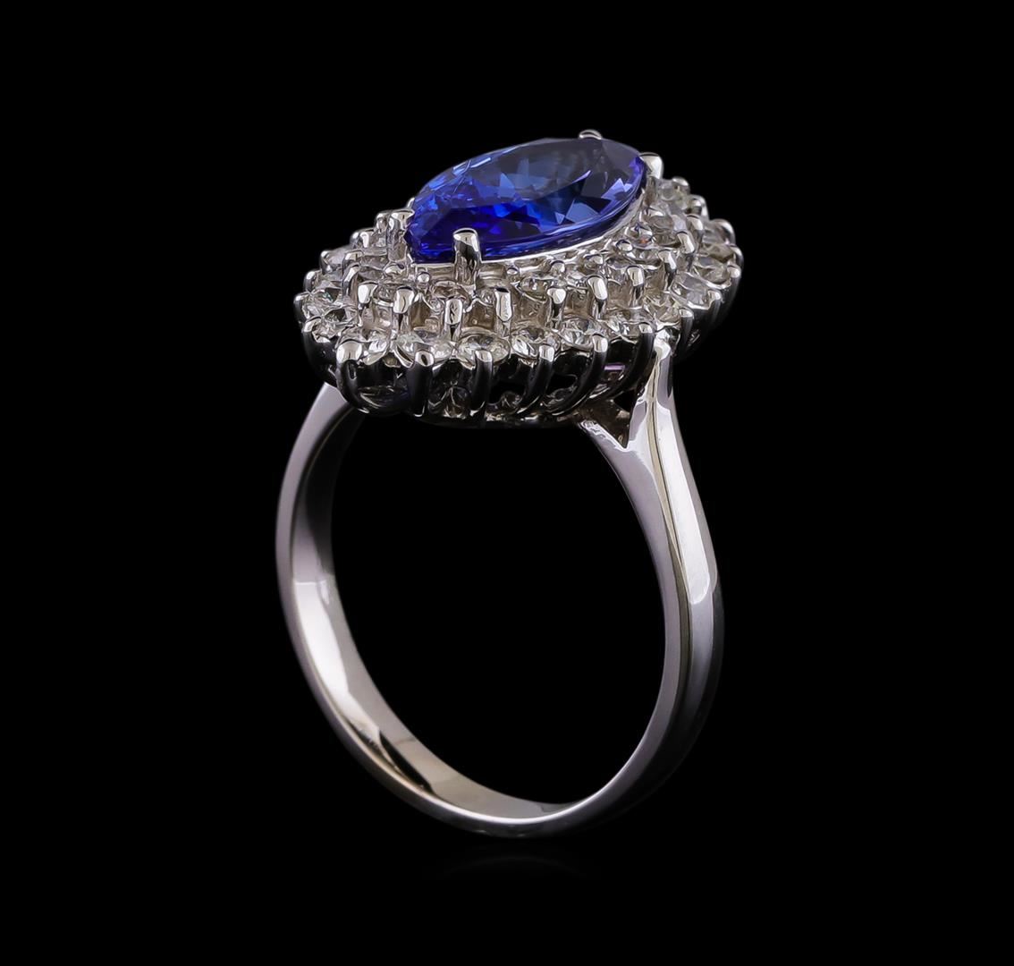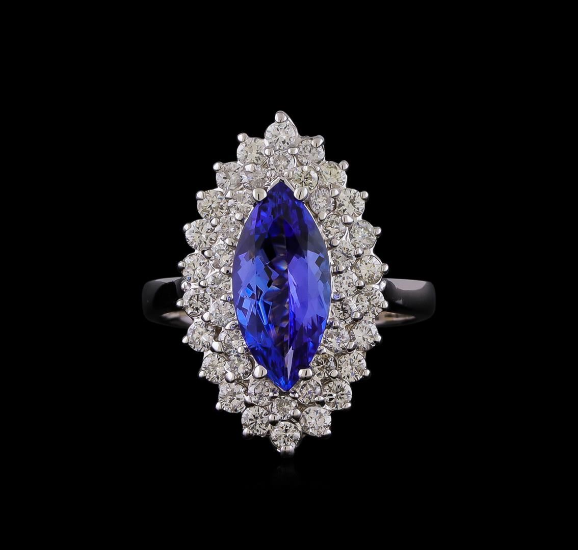 One electronically tested 14KT white gold lady's cast fashion ring with a double basket halo with a bright polish finish. The featured lady's has a shank measuring 2.50 millimeters in width. Identified with markings of "K14". Condition is new, good workmanship. Containing: One prong set marquise modified brilliant cut natural tanzanite, measuring 14.00 x 6.57 x 3.90mm, (depth est.) approximate weight of 2.22ct., clarity is eye clean, medium, moderately strong, bluish violet color, (GIA bV 5/4), cut is very good. Transmitting light with no distortion, transparent. Colored gemstones are presumed to have been subjected to commonly used enhancement processes. Graded in the setting. Twenty-Two prong set round brilliant cut diamonds, measuring 2.10 - 2.00 x 1.27mm (depth est.) approximate total weight of 22 Stones = 0.70ct. Graded in the setting. Clarity: SI-1 to SI-2. Color: G - Good Twenty prong set round brilliant cut diamonds, measuring 1.80 - 1.75 x 1.10mm (depth est.) approximate total weight of 20 Stones = 0.45ct. Graded in the setting. Clarity: SI-1 to SI-2. Color: G - Good. Total Weight of Colored Stones 2.22ct. Total Weight of Diamonds 1.15ct. Total Weight of Ring 5.80gm. GAS Appraised.