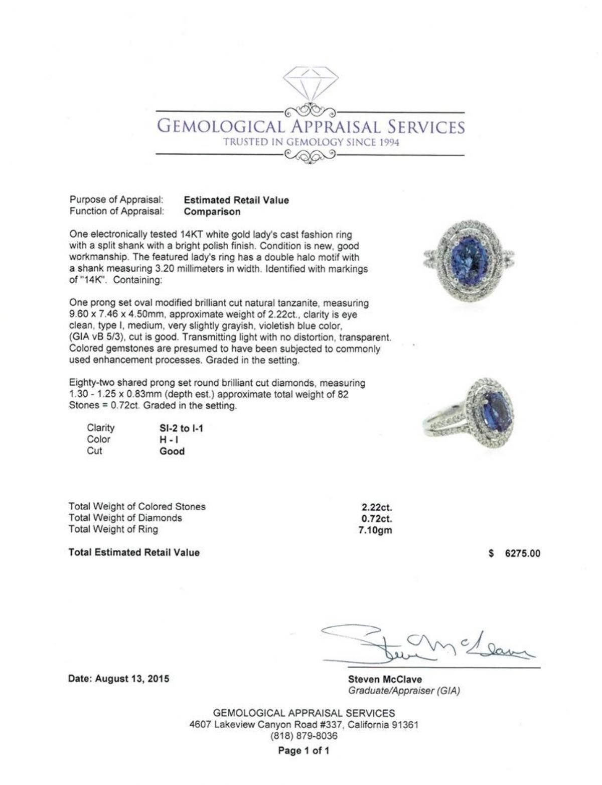 One electronically tested 14KT white gold lady's cast fashion ring with a split shank with a bright polish finish. The featured lady's ring has a double halo motif with a shank measuring 3.20 millimeters in width. Identified with markings of "14K". Condition is new, good workmanship. Containing: One prong set oval modified brilliant cut natural tanzanite, measuring 9.60 x 7.46 x 4.50mm, approximate weight of 2.22ct., clarity is eye clean, type I, medium, very slightly grayish, violetish blue color, (GIA vB 5/3), cut is good. Transmitting light with no distortion, transparent. Colored gemstones are presumed to have been subjected to commonly used enhancement processes. Graded in the setting. Eighty-Two shared prong set round brilliant cut diamonds, measuring 1.30 - 1.25 x 0.83mm (depth est.) approximate total weight of 82 Stones = 0.72ct. Graded in the setting. Clarity: SI-2 to I-1. Color: H - I. Cut Good. Total Weight of Colored Stones 2.22ct. Total Weight of Diamonds 0.72ct. Total Weight of Ring 7.10gm. GAS Appraised.