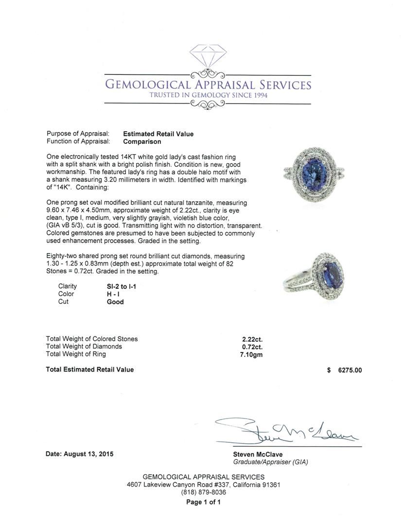 One electronically tested 14KT white gold lady's cast fashion ring with a split shank with a bright polish finish. The featured lady's ring has a double halo motif with a shank measuring 3.20 millimeters in width. Identified with markings of "14K". Condition is new, good workmanship. Containing: One prong set oval modified brilliant cut natural tanzanite, measuring 9.60 x 7.46 x 4.50mm, approximate weight of 2.22ct., clarity is eye clean, type I, medium, very slightly grayish, violetish blue color, (GIA vB 5/3), cut is good. Transmitting light with no distortion, transparent. Colored gemstones are presumed to have been subjected to commonly used enhancement processes. Graded in the setting. Eighty-Two shared prong set round brilliant cut diamonds, measuring 1.30 - 1.25 x 0.83mm (depth est.) approximate total weight of 82 Stones = 0.72ct. Graded in the setting. Clarity: SI-2 to I-1. Color: H - I. Cut Good. Total Weight of Colored Stones 2.22ct. Total Weight of Diamonds 0.72ct. Total Weight of Ring 7.10gm.