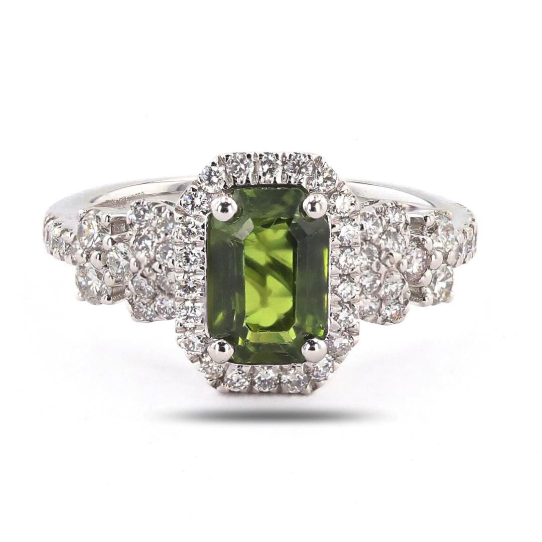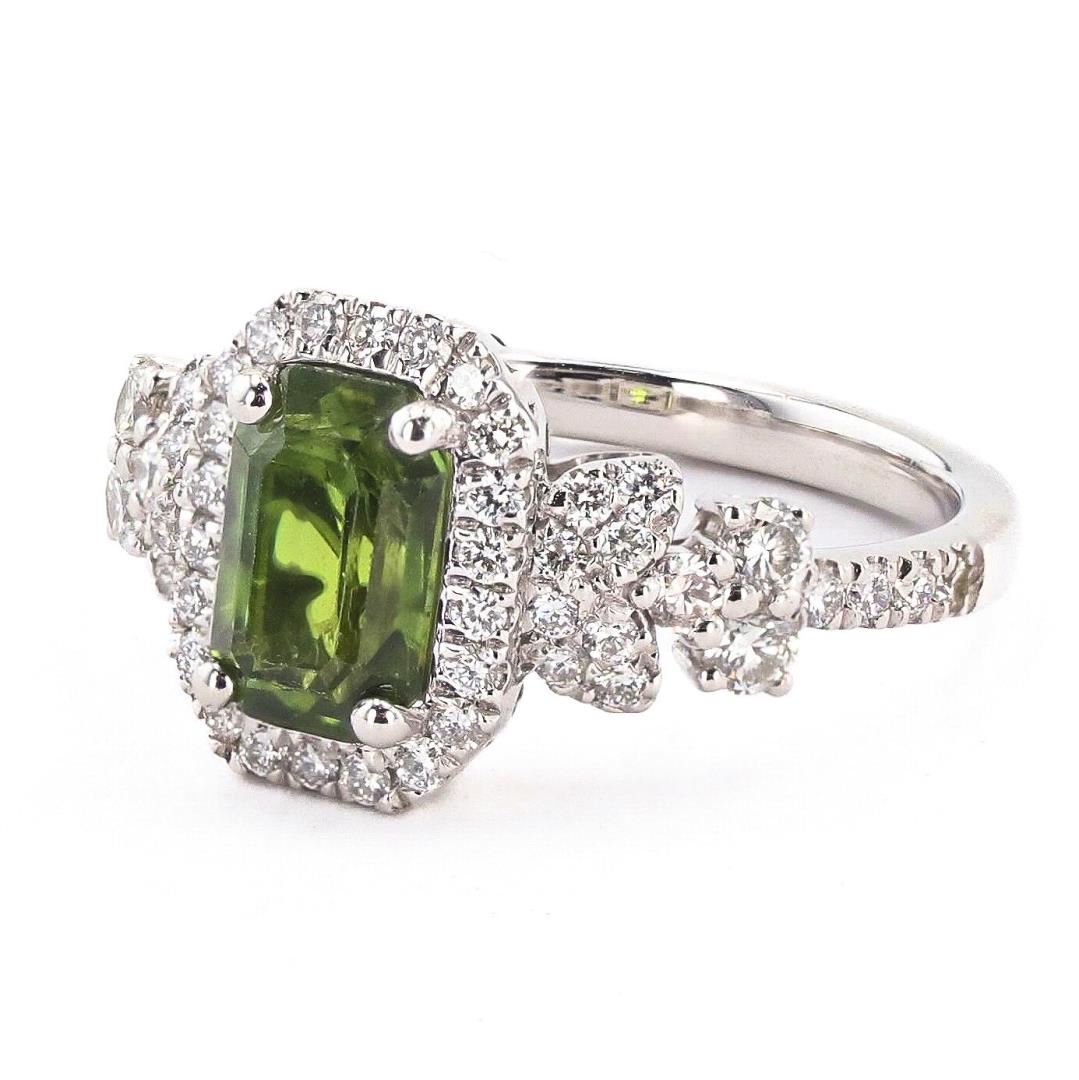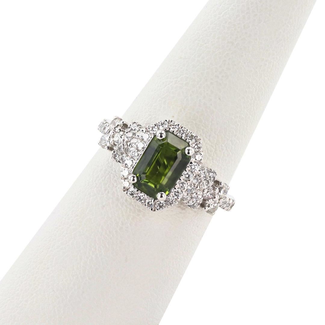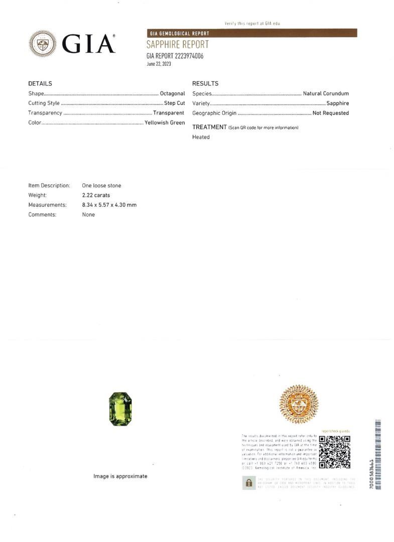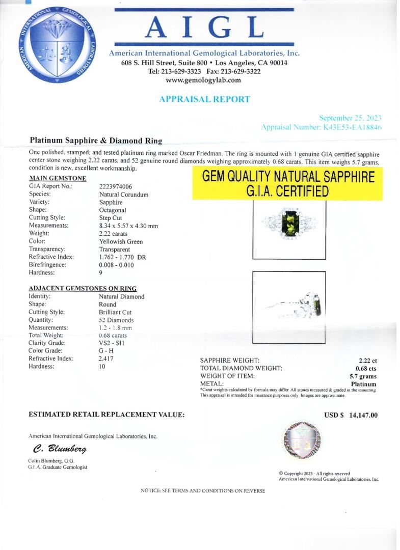 One polished, stamped, and tested platinum ring marked Oscar Friedman. The ring is mounted with 1 genuine GIA certified sapphire center stone weighing 2.22 carats, and 52 genuine round diamonds weighing approximately 0.68 carats. This item weighs 5.7 grams, condition is new, excellent workmanship. #MAIN GEMSTONE# GIA Report No.: 2223974006 Species: Natural Corundum Variety: Sapphire Shape: Octagonal Cutting Style: Step Cut Measurements: 8.34 x 5.57 x 4.30mm Weight: 2.22 carats Color: Yellowish Green Transparency: Transparent Refractive Index: 1.762 - 1.770 DR Birefringence: 0.008 - 0.010 Hardness: 9 #ADJACENT GEMSTONES ON RING# Identity: Natural Diamond Shape: Round Cutting Style: Brilliant Cut Quantity: 52 Diamonds Measurements: 1.2 - 1.8mm Total Weight: 0.68 carats Clarity Grade: VS2-SI1 Color Grade: G-H Refractive Index: 2.417 Hardness: 10 SAPPHIRE WEIGHT: 2.22 ct TOTAL DIAMOND WEIGHT: 0.68 cts WEIGHT OF ITEM: 5.7 grams METAL: Platinum Size: 6 3/4