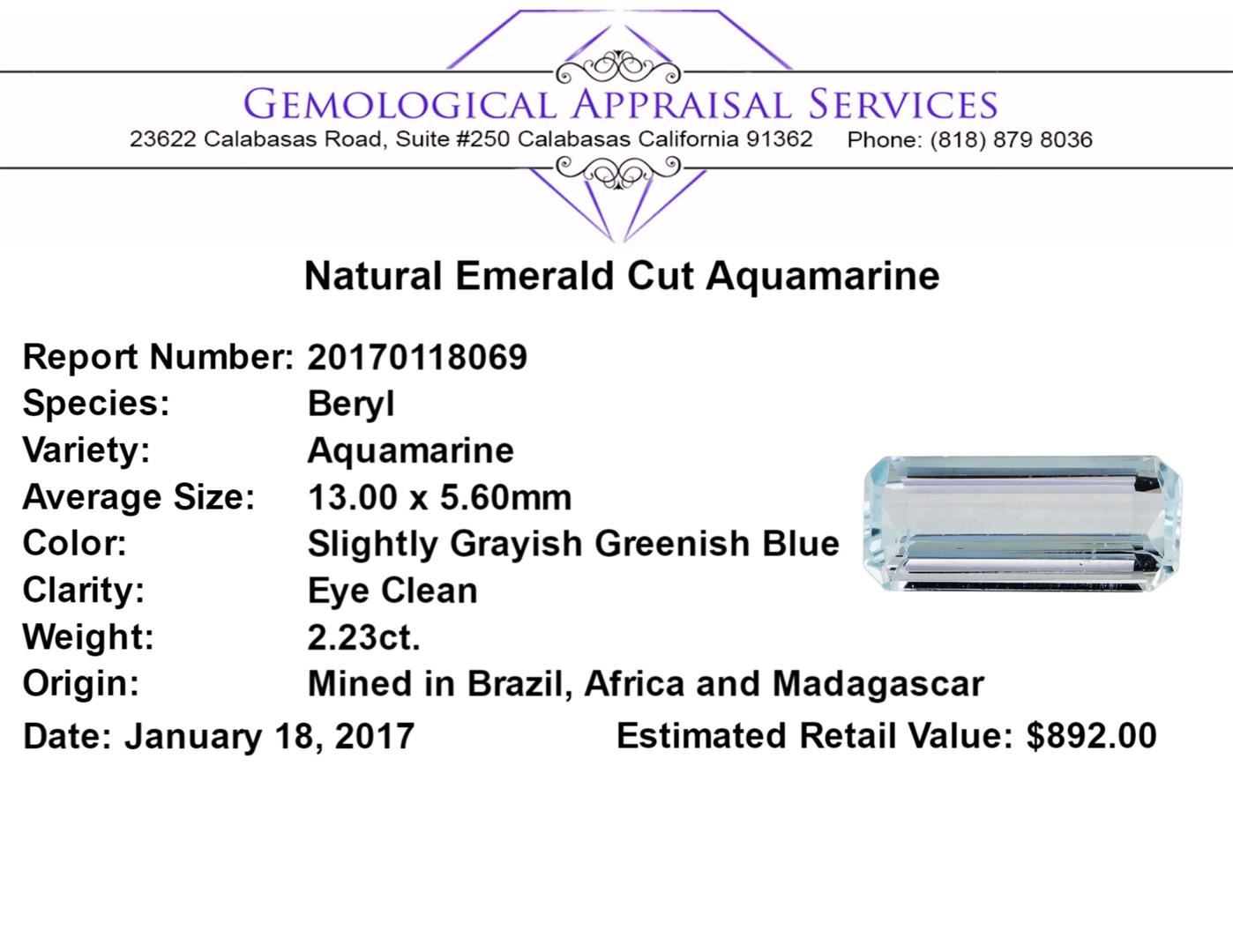 One natural emerald cut aquamarine with an exact weight of 2.23ct., clarity is eye clean, slightly grayish greenish blue. Gemological Appraisals Services estimates the retail value at $892 GAS Appraised.