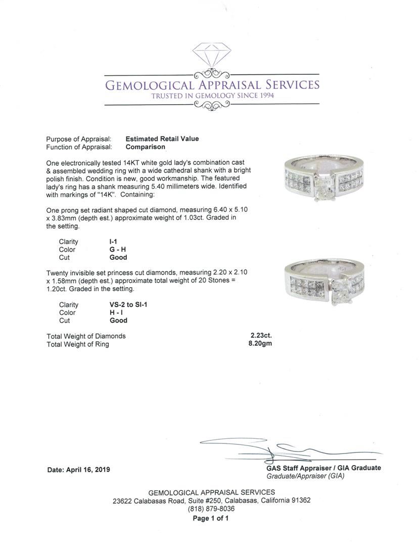 One electronically tested 14KT white gold lady's combination cast & assembled wedding ring with a wide cathedral shank with a bright polish finish. The featured lady's ring has a shank measuring 5.40 millimeters wide. Identified with markings of '14K'. Condition is new, good workmanship. Containing: One prong set radiant shaped cut diamond, measuring 6.40 x 5.10 x 3.83mm (depth est.) approximate weight of 1.03ct. Graded in the setting. Color G - H Clarity I-1 Cut Good Twenty invisible set princess cut diamonds, measuring 2.20 x 2.10 x 1.58mm (depth est.) approximate total weight of 20 Stones = 1.20ct. Graded in the setting. Color H - I Clarity VS-2 to SI-1 Cut Good. Total Weight of Diamonds 2.23ct.. Total Weight of Ring 8.20gm GAS Appraised at $9165.00. GAS Appraised at $9,165.00.