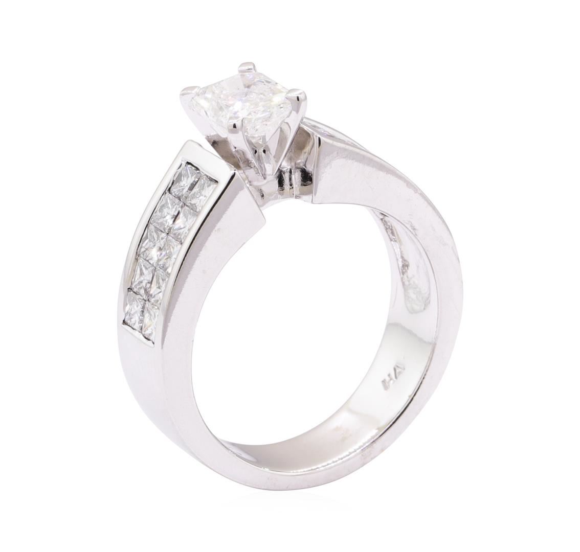 One electronically tested 14KT white gold lady's combination cast & assembled wedding ring with a wide cathedral shank with a bright polish finish. The featured lady's ring has a shank measuring 5.40 millimeters wide. Identified with markings of '14K'. Condition is new, good workmanship. Containing: One prong set radiant shaped cut diamond, measuring 6.40 x 5.10 x 3.83mm (depth est.) approximate weight of 1.03ct. Graded in the setting. Color G - H Clarity I-1 Cut Good Twenty invisible set princess cut diamonds, measuring 2.20 x 2.10 x 1.58mm (depth est.) approximate total weight of 20 Stones = 1.20ct. Graded in the setting. Color H - I Clarity VS-2 to SI-1 Cut Good. Total Weight of Diamonds 2.23ct.. Total Weight of Ring 8.20gm GAS Appraised at $9165.00. GAS Appraised at $9,165.00.
