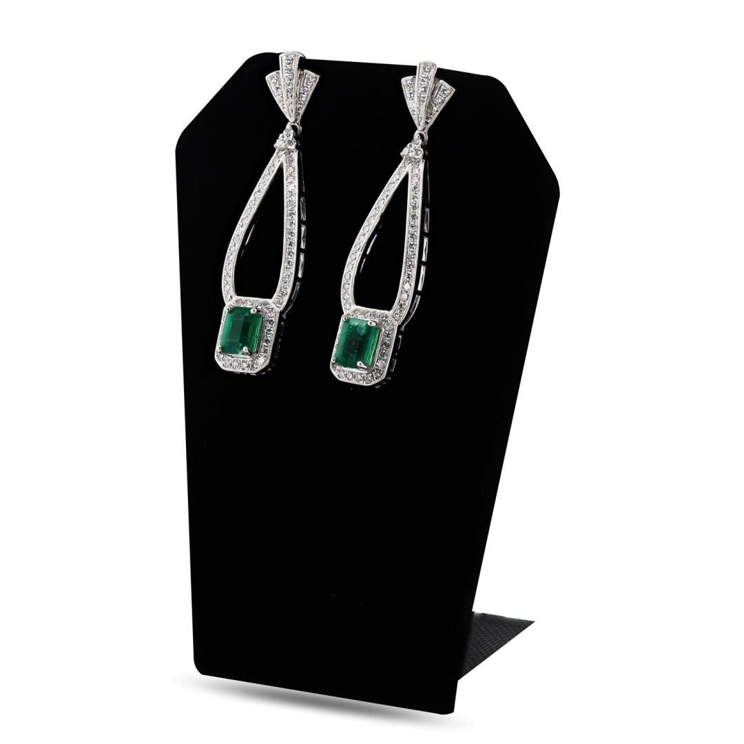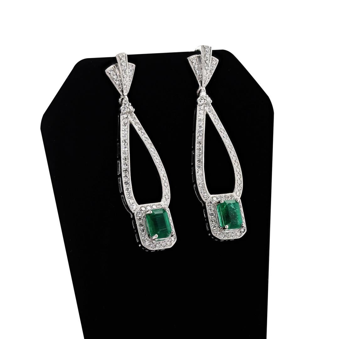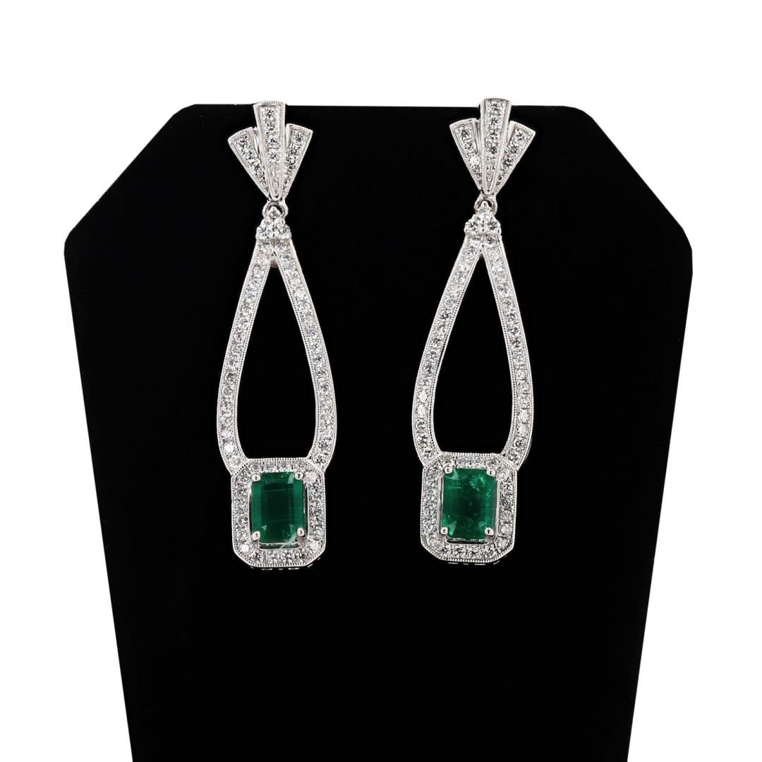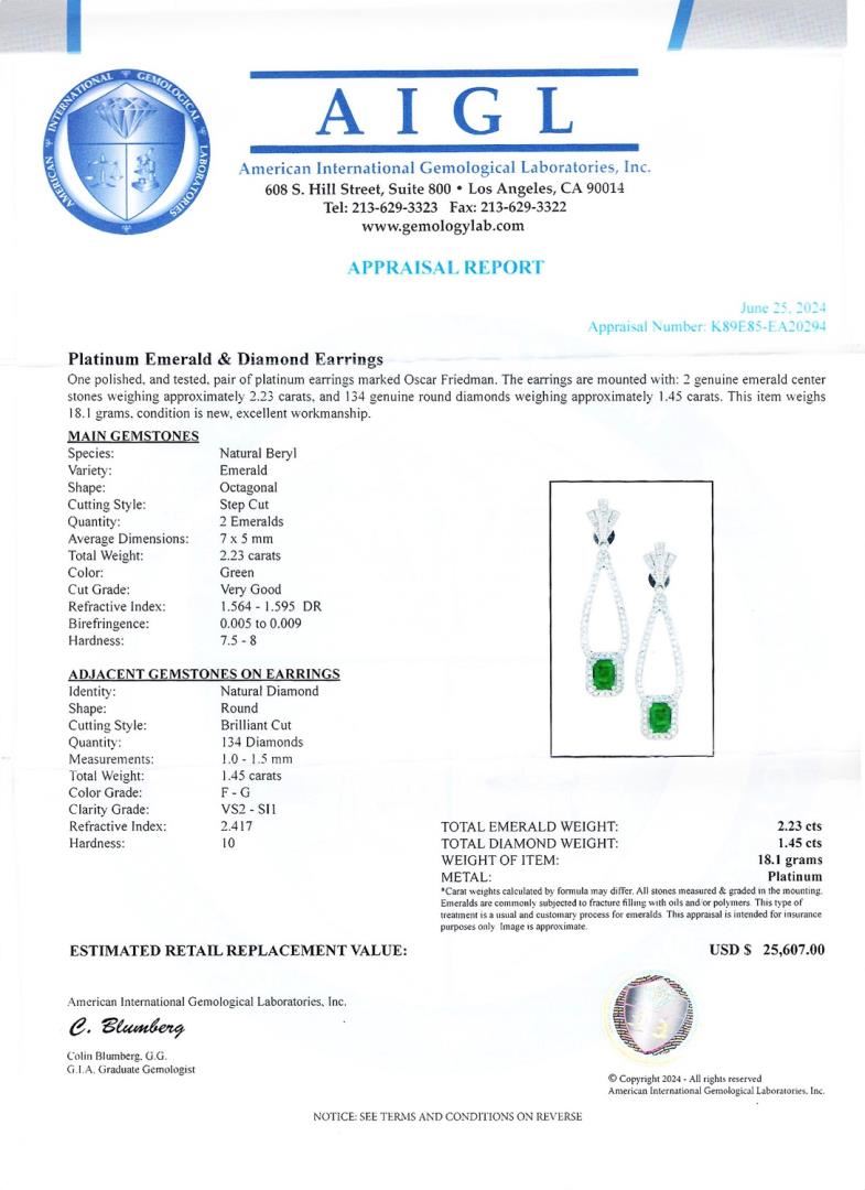 One polished. and tested. pair of platinum earrings marked Oscar Friedman. The earrings are mounted with: 2 genuine emerald center stones weighing approximately 2.23 carats, and 134 genuine round diamonds weighing approximately 1.45 carats. This item weighs 18.1 grams, condition is new, excellent workmanship. #MAIN GEMSTONES# Species: Natural Beryl Variety: Emerald Shape: Octagonal Cutting Style: Step Cut Quantity: 2 Emeralds Average Dimensions: 7 x 5mm Total Weight: 2.23 carats Color: Green Cut Grade: Very Good Refractive Index: 1.564 - 1.595 DR Birefringence: 0.005 to 0.009 Hardness: 7.5 - 8 #ADJACENT GEMSTONES ON EARRINGS# Identity: Natural Diamond Shape: Round Cutting Style: Brilliant Cut Quantity: 134 Diamonds Measurements: 1.0 - 1.5mm Total Weight: 1.45 carats Color Grade: F-G Clarity Grade: VS2-SI1 Refractive Index: 2.417 Hardness: 10 TOTAL EMERALD WEIGHT: 2.23 cts TOTAL DIAMOND WEIGHT: 1.45 cts WEIGHT OF ITEM: 18.1 grams METAL: Platinum