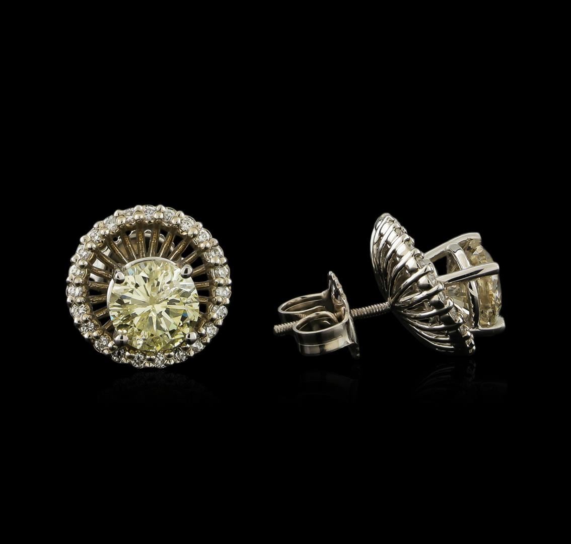 One pair electronically tested 14KT white gold cast & assembled diamond earrings with jackets. Each earring features a round diamond solitaire set within a diamond jacket. Standard backings. Bright polish finish Identified with markings of "14K". Condition is new, good workmanship. Containing: One prong set round brilliant cut diamond, measuring 6.37 - 6.30 x 3.90mm (depth est.), 3.00.%. GTCF approximate weight of 1.00ct. Graded in the setting. Clarity: I-2. Color: 61.5%. Table 59.9%. One prong set round brilliant cut diamond, measuring 6.30 - 6.25 x 4.00mm (depth est.), 3.00.%. GTCF approximate weight of 1.00ct with a medium strong blue fluorescence. Graded in the setting. Clarity: I-2. Color: M. Depth 63.7%. Table 63.4%. Forty-Six prong set round brilliant cut diamonds, measuring 1.15 - 1.10 x 0.69mm (depth est.) approximate total weight of 46 Stones = 0.24ct. Set & graded in the earring jackets. Clarity: VS-2 to SI-1. Color: H - I. Total Weight of Diamonds 2.24ct. Total Weight of Earrings With Jackets 3.32gm. AIG Appraised at $11,000.00.
