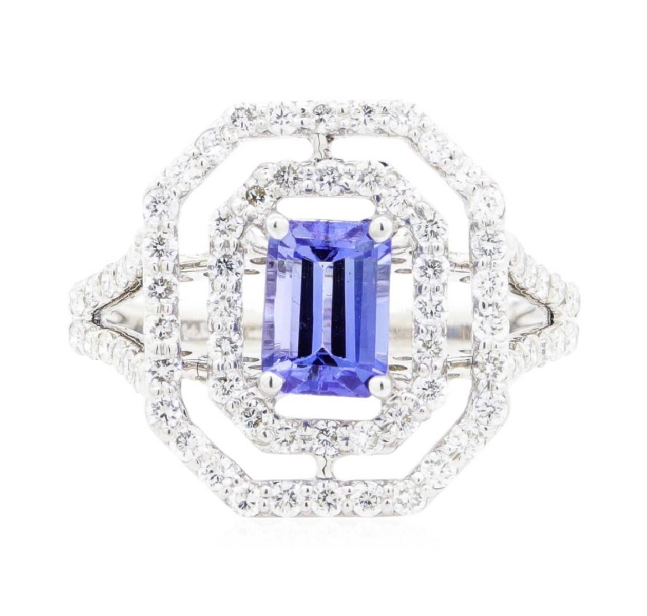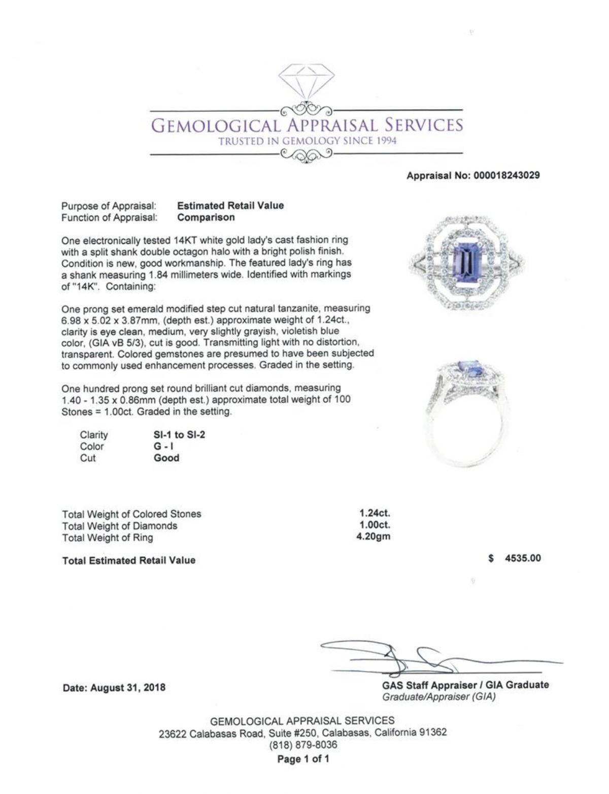 One electronically tested 14KT white gold lady's cast fashion ring with a split shank double octagon halo with a bright polish finish. The featured lady's ring has a shank measuring 1.84 millimeters wide. Identified with markings of '14K'. Condition is new, good workmanship. Containing: One prong set emerald modified step cut natural tanzanite, measuring 6.98 x 5.02 x 3.87mm, (depth est.) approximate weight of 1.24ct., clarity is eye clean, medium, very slightly grayish, violetish blue color, (GIA vB 5/3), cut is good. Transmitting light with no distortion, transparent. Colored gemstones are presumed to have been subjected to commonly used enhancement processes. Graded in the setting. One Hundred prong set round brilliant cut diamonds, measuring 1.40 - 1.35 x 0.86mm (depth est.) approximate total weight of 100 Stones = 1.00ct. Graded in the setting. Color G - I Clarity SI-1 to SI-2 Cut Good. Total Weight of Colored Stones 1.24ct.. Total Weight of Diamonds 1.00ct.. Total Weight of Ring 4.20gm GAS Appraised at  $4535.00. GAS Appraised.