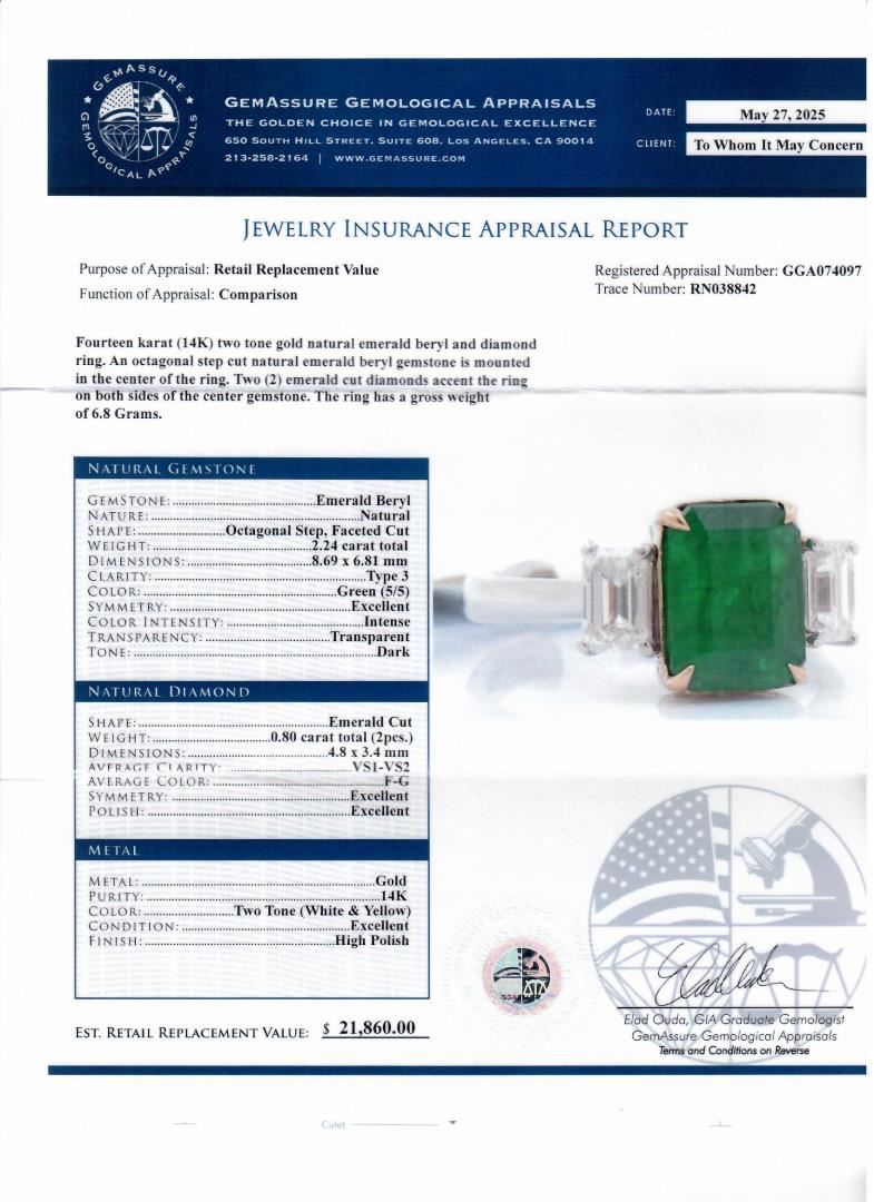 Fourteen karat (14K) two tone gold natural emerald beryl and diamond ring. An octagonal step cut natural emerald beryl gemstone is mounted in the center of the ring. Two (2) emerald cut diamonds accent the ring on both sides of the center gemstone. The ring has a gross weight of 6.8 Grams. #NATURAL GEMSTONE# GEMSTONE: Emerald Beryl; NATURE: Natural; SHAPE: Octagonal Step, Faceted Cut; WEIGHT: 2.24 carat total; DIMENSIONS: 8.69 x 6.81mm; CLARITY: Type 3; COLOR: Green; SYMMETRY: Excellent; COLOR INTENSITY: Intense; TRANSPARENCY: Transparent; TONE: Dark #NATURAL DIAMOND# SHAPE: Emerald Cut; WEIGHT: 0.80 carat total (2pcs.); DIMENSIONS: 4.8 x 3.4mm; AVERAGE CLARITY: VS1-VS2; AVERAGE COLOR: F-G; SYMMETRY: Excellent; POLISH: Excellent #METAL# METAL: Gold; PURITY: 14K; COLOR: Two Tone (White & Yellow); CONDITION: Excellent; FINISH: High Polish #Size: 7