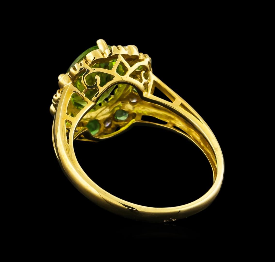 One ring featuring: 10KT yellow gold weighing 2.48 grams containing one peridot center stone with a total weight of 2.24ct, eight tsavorite side stones with a total weight of 0.33ct, and 8 round diamonds.