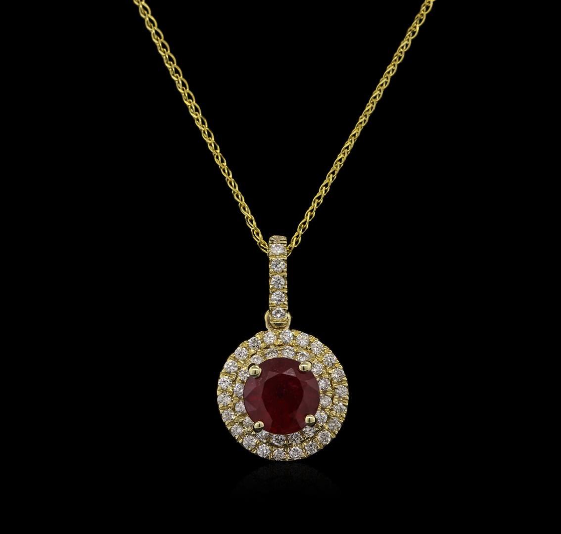 One pendant with chain featuring: 14KT yellow gold weighing 2.65 grams containing one ruby center stone with a total weight of 2.24ct and 44 diamonds with a total weight of 0.41ct.
