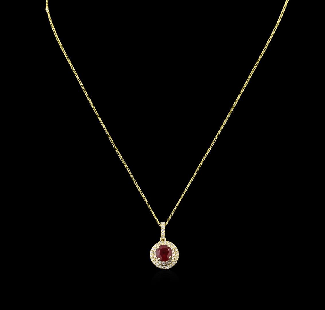 One pendant with chain featuring: 14KT yellow gold weighing 2.65 grams containing one ruby center stone with a total weight of 2.24ct and 44 diamonds with a total weight of 0.41ct.