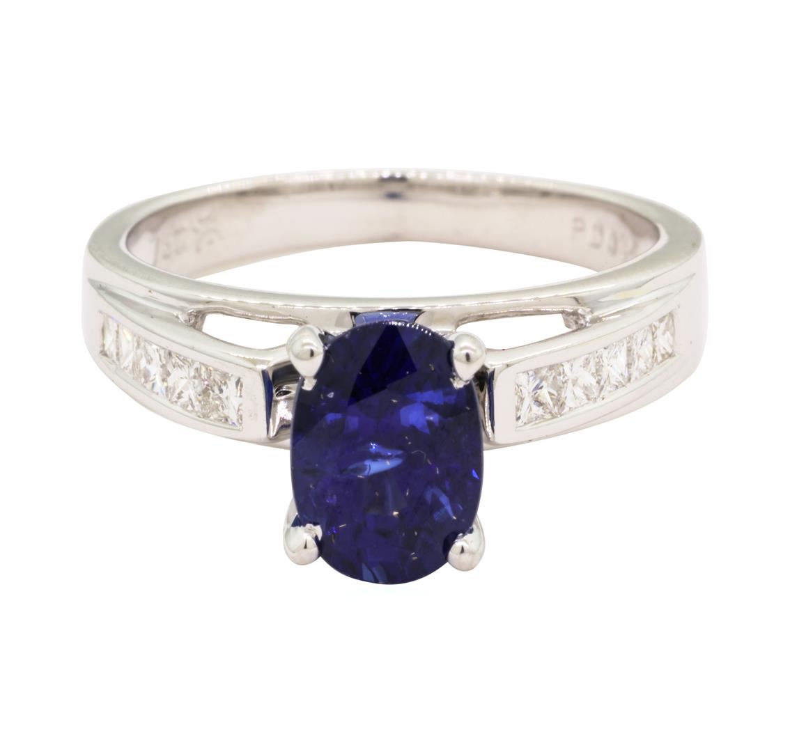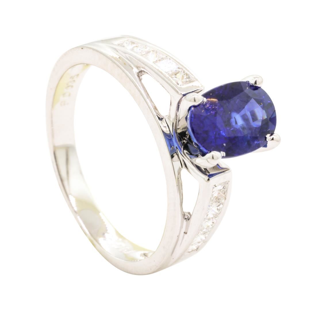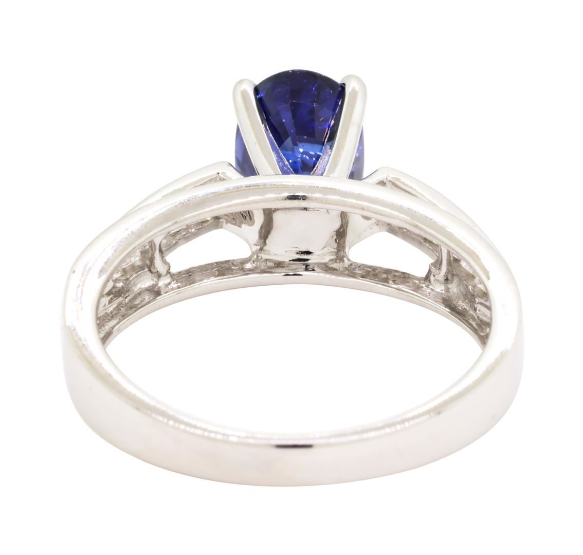 One lady's ring featuring: 18KT white gold weighing 4.8 grams containing one fine blue oval sapphire weighing 2.24ct and diamonds weighing 0.35ctw.