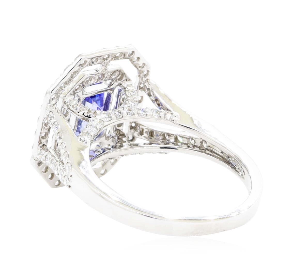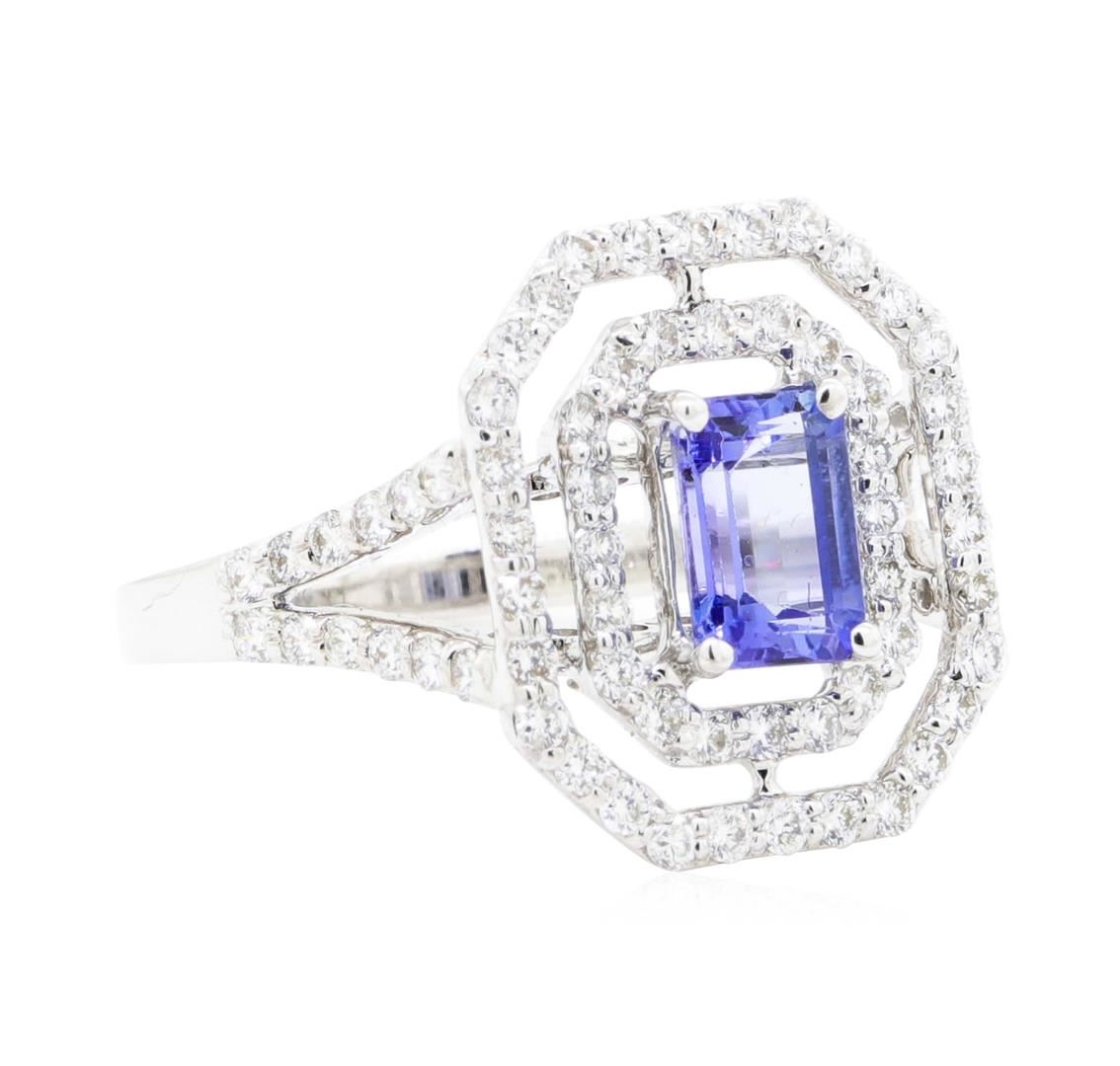 One electronically tested 14KT white gold lady's cast fashion ring with a split shank double octagon halo with a bright polish finish. The featured lady's ring has a shank measuring 1.84 millimeters wide. Identified with markings of '14K'. Condition is new, good workmanship. Containing: One prong set emerald modified step cut natural tanzanite, measuring 6.98 x 5.02 x 3.87mm, (depth est.) approximate weight of 1.24ct., clarity is eye clean, medium, very slightly grayish, violetish blue color, (GIA vB 5/3), cut is good. Transmitting light with no distortion, transparent. Colored gemstones are presumed to have been subjected to commonly used enhancement processes. Graded in the setting. One Hundred prong set round brilliant cut diamonds, measuring 1.40 - 1.35 x 0.86mm (depth est.) approximate total weight of 100 Stones = 1.00ct. Graded in the setting. Color G - I Clarity SI-1 to SI-2 Cut Good. Total Weight of Colored Stones 1.24ct.. Total Weight of Diamonds 1.00ct.. Total Weight of Ring 4.20gm GAS Appraised at $4535.00. GAS Appraised at $4,535.00.