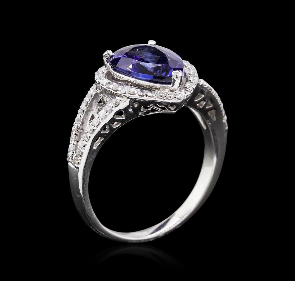 One electronically tested 14KT white gold ladies cast tanzanite and diamond ring with a bright polish finish. The featured tanzanite is set within a diamond bezel supported by diamond set split shoulders, completed by a two millimeter wide band. Condition is new, good workmanship. Containing: One prong set pear mixed cut natural tanzanite, measuring 11.00 x 7.80 x 3.75mm, 5%. bulge factor, approximate weight of 2.24ct., clarity is eye clean, type I, dark, very slightly grayish, blue color, (GIA B 7/3), cut is good. Natural Tanzanite, color enhanced due to cobalt coating. The presence of the coating prevents determining the stone's actual depth of color. Transmitting light with no distortion, transparent. Grading in the setting. The cobalt coated Tanzanite has a low tolerance to ultrasonic cleaning, and should not be cleaned using this method. Tanzanite is a very rare gemstone that is only found in the country of Tanzania. Originally discovered in 1967. Tiffany & Company, named the stone Tanzanite. It is found in the Usumburu Mountains that border the Umba Valley of northern Tanzania. Tanzanite occurs in gray, brown, violet, blue, reddish-purple, & green. The gem is interesting because of its exceptional pleochroism. Rotated in different directions a tanzanite will exhibit multiple changes of color. Sixty-Nine prong set round brilliant cut diamonds, measuring 1.00 - 1.00 x 0.60mm (depth est.) approximate total weight of 69 Stones = 0.29ct. Graded in the setting. Clarity: I-1 to I-2. Color: H - J. Total Weight of Colored Stones 2.24ct. Total Weight of Diamonds 0.29ct. AIG Appraised at $2,840.00.
