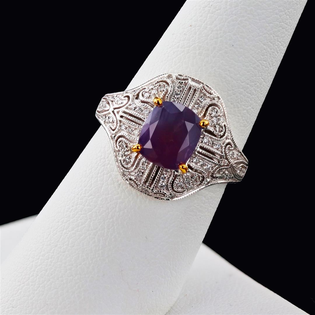 Platinum (PLAT) two tone natural ruby corundum and diamond ring. A cushion brilliant cut natural ruby corundum gemstone is mounted in the center of the ring. Round brilliant cut diamonds accent the ring around and on both sides of the the center gemstone. The ring has a gross weight of 6.8 Grams. Reference: GIA Ruby Report #2225275705 #NATURAL GEMSTONE# GEMSTONE: Ruby Corundum NATURE: Natural SHAPE: Cushion Brilliant, Faceted Cut WEIGHT: 2.24 carat total DIMENSIONS: 8.14 x 7.06 x 4.29mm CLARITY: Type 2 COLOR: Red (5/5) SYMMETRY: Excellent COLOR INTENSITY: Intense TRANSPARENCY: Transparent TONE: Dark #NATURAL DIAMOND# SHAPE: Round Brilliant Cut WEIGHT: 0.20 carat total (70pcs.) DIMENSIONS: 0.8 x 0.6mm AVERAGE CLARITY: VS2-SI1 AVERAGE COLOR: G-H SYMMETRY: Excellent POLISH: Excellent #METAL# METAL: Platinum PURITY: 950 COLOR: Two Tone CONDITION: Excellent FINISH: High Polish