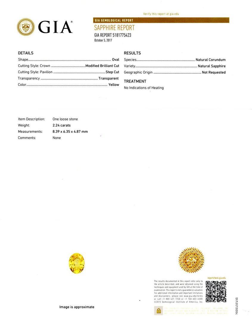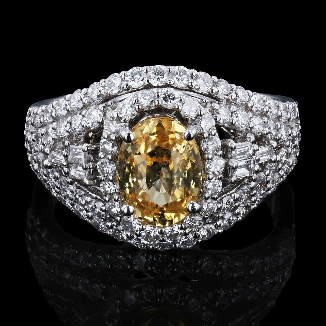 One electronically tested platinum cast yellow sapphire & diamond ring. Condition is new, good workmanship. The featured yellow sapphire is set within an inner diamond bezel and a curvature of diamond ribbons transitioning to a tapering three millimeter w