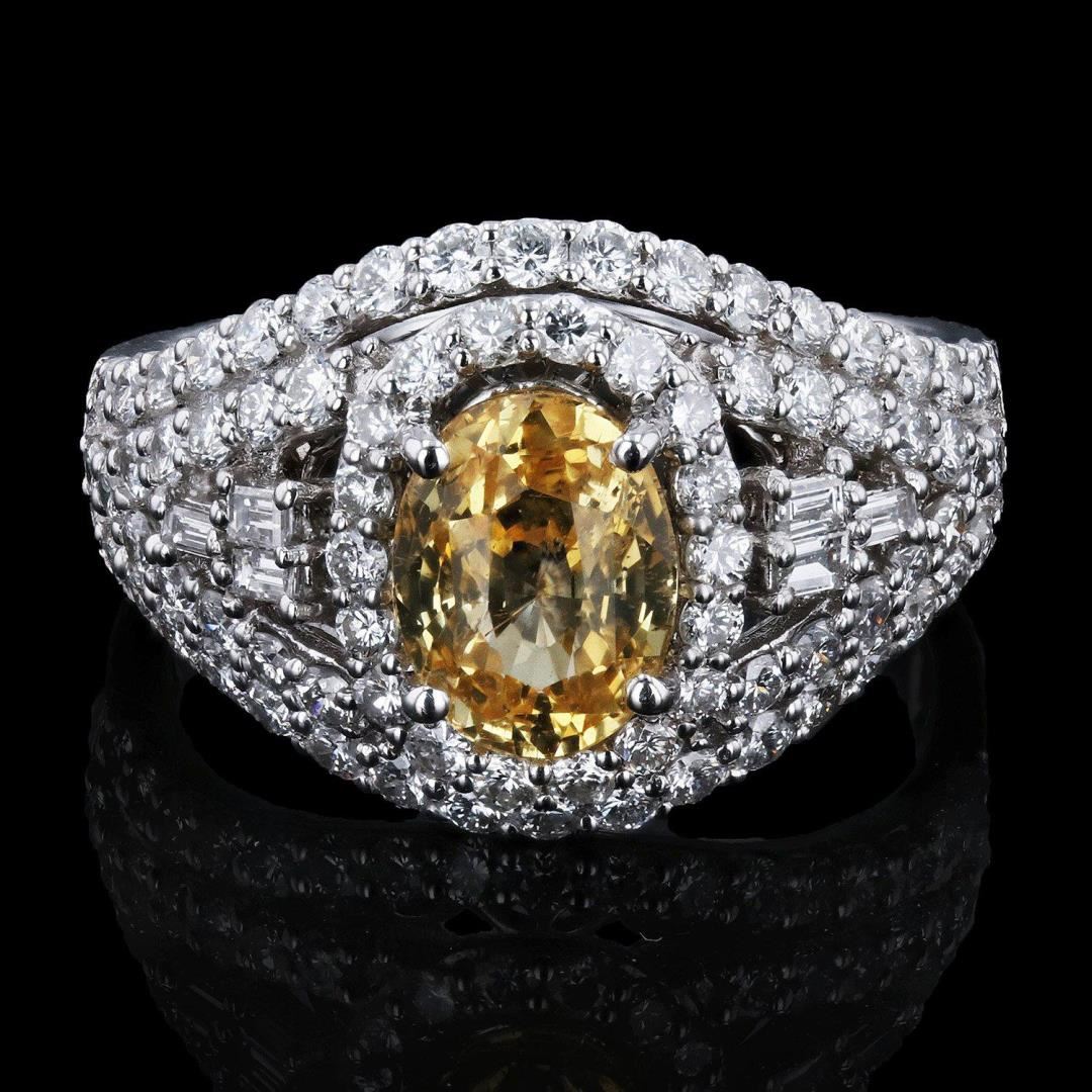 One electronically tested platinum cast yellow sapphire & diamond ring. Condition is new, good workmanship. The featured yellow sapphire is set within an inner diamond bezel and a curvature of diamond ribbons transitioning to a tapering three millimeter wide band. Trademark is Orianne. Identified with markings of "PT950". Containing: One prong set oval mixed cut natural yellow sapphire, measuring 8.39 x 6.35 x 4.87mm, exact weight 2.24ct., clarity is slightly included, medium, brownish, yellow color, (GIA Y 5/3), cut is good. Transmitting light with no distortion, transparent. Naturally occurring internal & external characteristics are present. No indications of heating (NTE). Graded loose prior to setting in the GIA Laboratory, Report # 5181775423. Eighty-two prong set round & baguette cut diamonds approximate total weight of 82 Stones = 1.50ctw. The clarity grade reflects the entire range for this group. Graded in the setting. Clarity VS1 to I1 Color G - I RARE UNHEATED SAPPHIRE G.I.A. CERTIFIED Total Weight of Colored Stones 2.24ct. Total Weight of Diamonds 1.50ctw. Total Weight of Ring 8.96 gm Size: 7 1/4