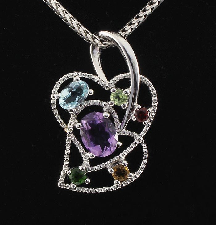 2.24CTW Multi-Color 2Hearts Sterling Silver Pendant 3.2 **|**|** 1.15 Inches Long 2 Hearts Pendant with Oval & Round Multi-color Semi Precious Gemstone (A-8x6;BT-6x4;GA-3;Cit-3;TS-3;G-2.5mm) ; MSRP: $0