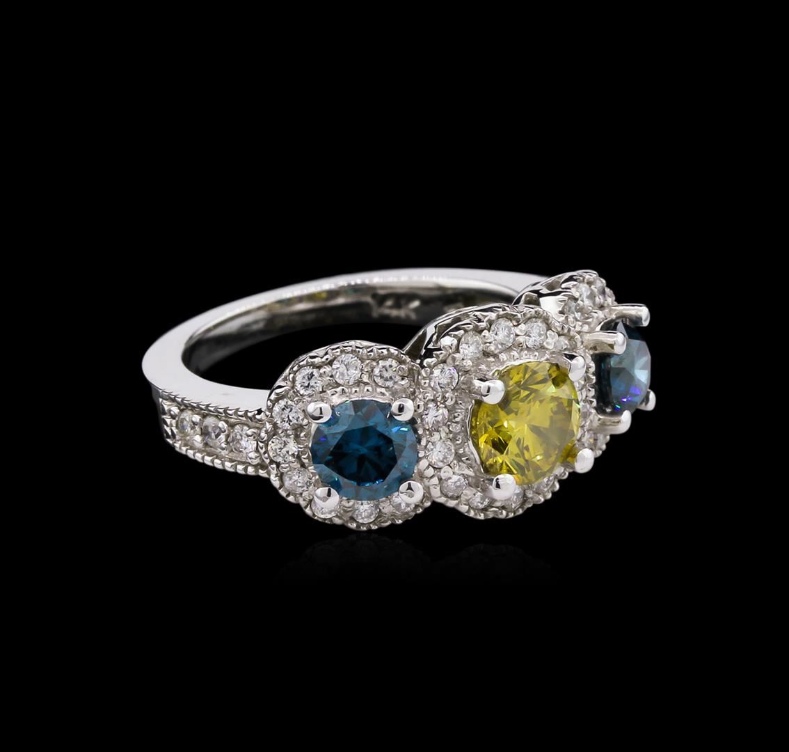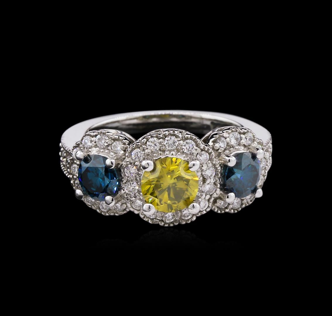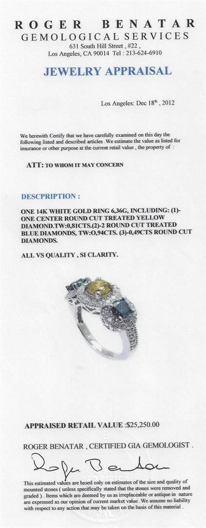 One 14KT White Gold ring 6.36G, Including: one center round cut treated yellow diamond TW 0.81 CtS. 2 round cut treated blue diamonds, TW 0.94 CTS. 0.49 CTS round cut diamonds. All VS Quality, SI Clarity. RBGS Appraised at $25,250.00.