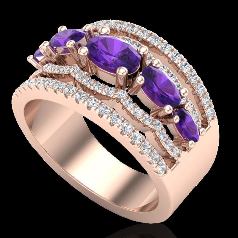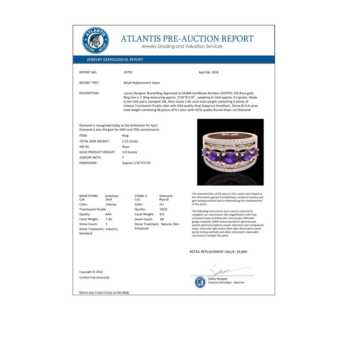 REF-66H9A -20791 ---- 2.25 CTW Amethyst & Micro Pave VS/SI Diamond Designer Ring 10K Rose Gold ---- Luxury Designer Brand Ring Appraised at $4,800 Certificate Number US20791 10k Rose gold, Ring Size is 7, Ring measuring approx. 7/16"X7/16" , weighing in total approx. 6.5 grams. Made in the USA and is stamped 10k, Main stone 1.65 carat total weight containing 5 pieces of Intense Translucent Purple color with AAA quality Oval shape cut Amethyst , Stone #2 0.6 carat total weight containing 68 pieces of H-I color with VS/SI quality Round shape cut Diamond