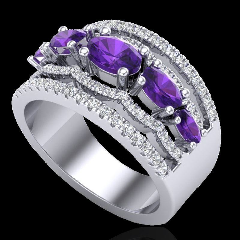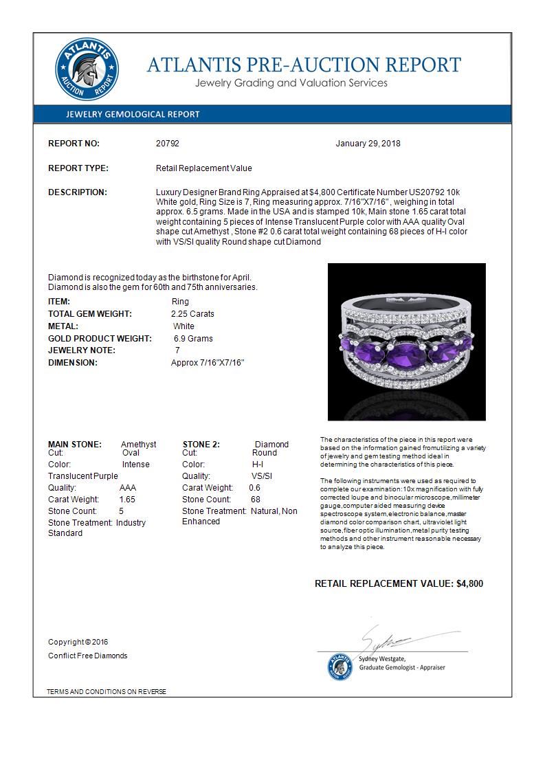 REF-66W9F -20792 ---- 2.25 CTW Amethyst & Micro Pave VS/SI Diamond Designer Ring 10K White Gold ---- Luxury Designer Brand Ring Appraised at $4,800 Certificate Number US20792 10k White gold, Ring Size is 7, Ring measuring approx. 7/16"X7/16" , weighing in total approx. 6.5 grams. Made in the USA and is stamped 10k, Main stone 1.65 carat total weight containing 5 pieces of Intense Translucent Purple color with AAA quality Oval shape cut Amethyst , Stone #2 0.6 carat total weight containing 68 pieces of H-I color with VS/SI quality Round shape cut Diamond