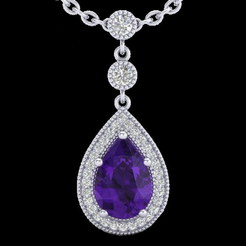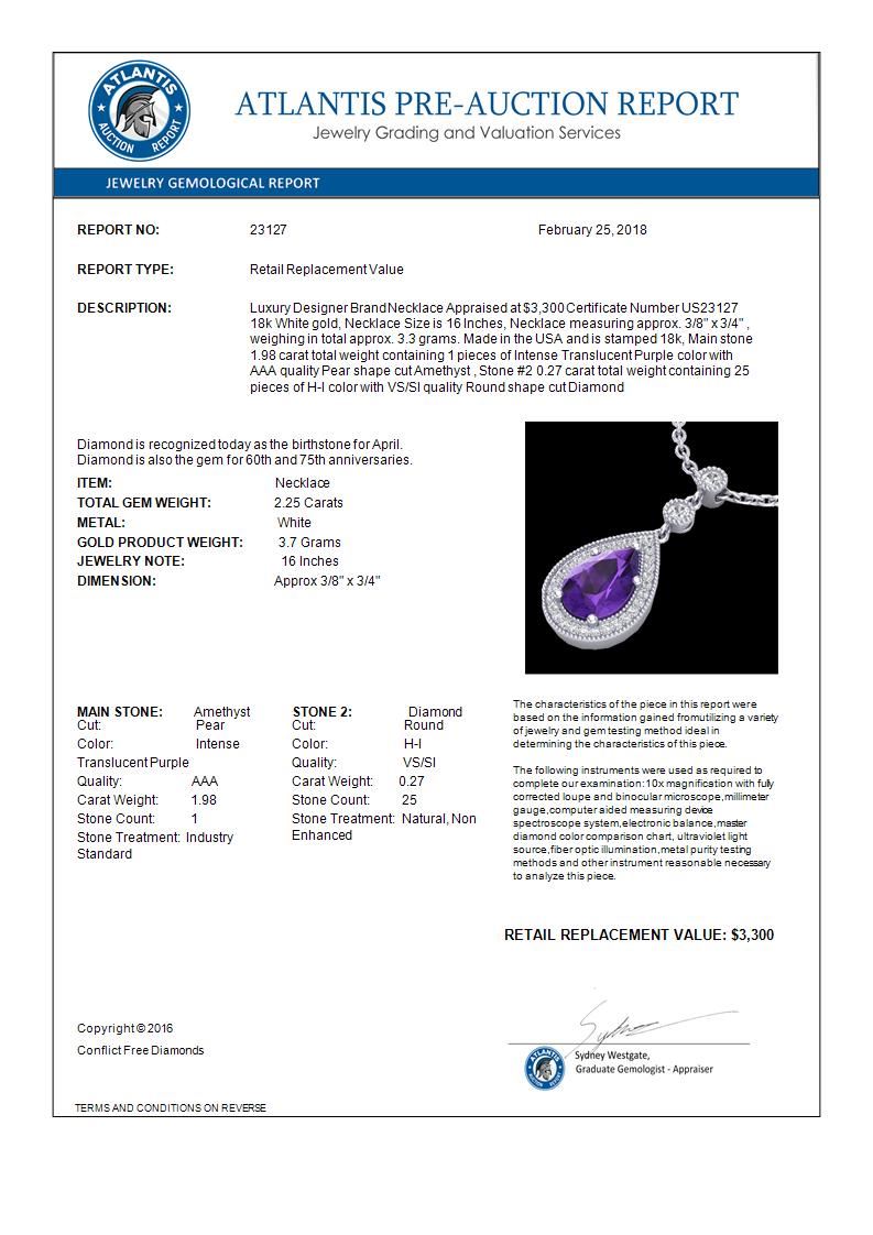 REF-46W2F -23127 ---- 2.25 CTW Amethyst & Micro Pave VS/SI Diamond Necklace Designer 18K White Gold ---- Luxury Designer Brand Necklace Appraised at $3,300 Certificate Number US23127 18k White gold, Necklace Size is 16 Inches, Necklace measuring approx. 3/8" x 3/4" , weighing in total approx. 3.3 grams. Made in the USA and is stamped 18k, Main stone 1.98 carat total weight containing 1 pieces of Intense Translucent Purple color with AAA quality Pear shape cut Amethyst , Stone #2 0.27 carat total weight containing 25 pieces of H-I color with VS/SI quality Round shape cut Diamond