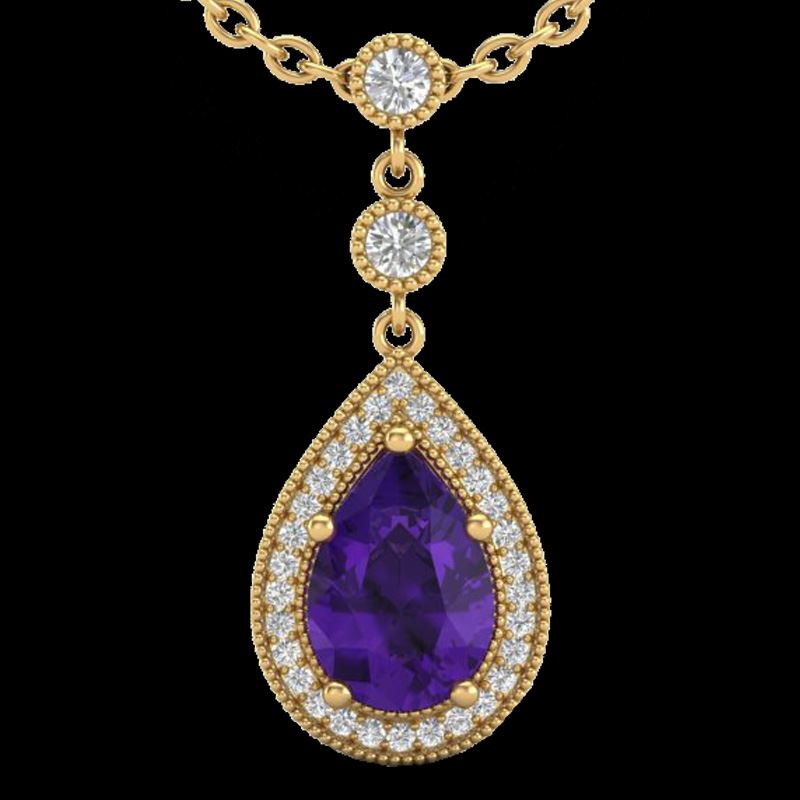 REF-50A2X -23129 ---- 2.25 CTW Amethyst & Micro Pave VS/SI Diamond Necklace Designer 18K Yellow Gold ---- Luxury Designer Brand Necklace Appraised at $3,600 Certificate Number US23129 18k Yellow gold, Necklace Size is 16 Inches, Necklace measuring approx. 3/8" x 3/4" , weighing in total approx. 3.3 grams. Made in the USA and is stamped 18k, Main stone 1.98 carat total weight containing 1 pieces of Intense Translucent Purple color with AAA quality Pear shape cut Amethyst , Stone #2 0.27 carat total weight containing 25 pieces of H-I color with VS/SI quality Round shape cut Diamond