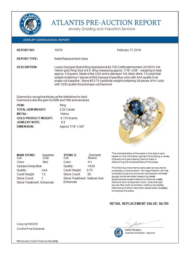 REF-71M5H -10574 ---- 2.25 CTW Blue Sapphire & Diamond Ring 14K Yellow Gold ---- Luxury Designer Brand Ring Appraised at $4,700 Certificate Number US10574 14k Yellow gold, Ring Size is 6.5, Ring measuring approx. 7/16" x 5/8" , weighing in total approx. 5.8 grams. Made in the USA and is stamped 14k, Main stone 1.5 carat total weight containing 1 pieces of Mid-Opaque-Deep Blue color with AAA quality Oval shape cut Sapphire , Stone #2 0.75 carat total weight containing 26 pieces of H-I color with VS/SI quality Round shape cut Diamond