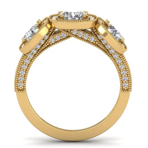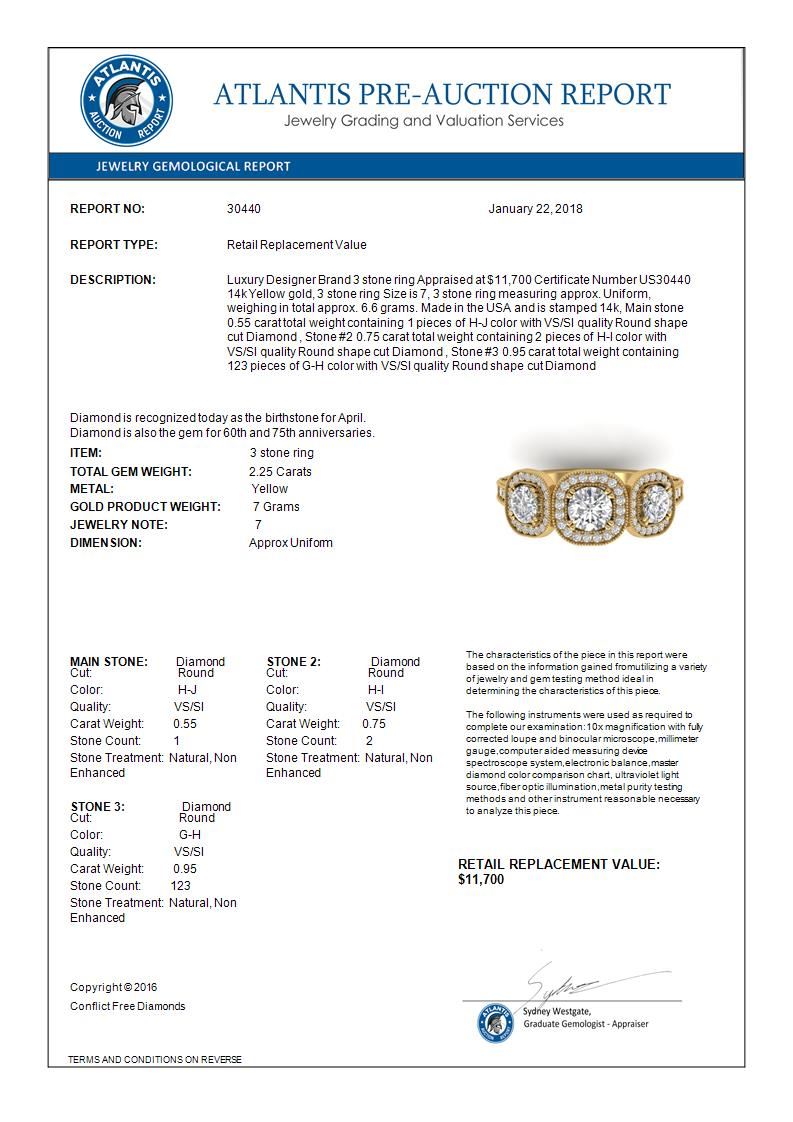 REF-236W2F -30440 ---- 2.25 CTW Certified VS/SI Diamond 3 Stone Micro Halo Ring 14K Yellow Gold ---- Luxury Designer Brand 3 stone ring Appraised at $11,700 Certificate Number US30440  14k Yellow gold,  3 stone ring Size is 7, 3 stone ring measuring approx. Uniform, weighing in total approx. 6.6 grams. Made in the USA and is stamped 14k, Main stone 0.55 carat total weight containing 1 pieces of H-J color with VS/SI quality Round shape cut Diamond , Stone #2 0.75 carat total weight containing 2 pieces of H-I color with  VS/SI quality Round shape cut Diamond , Stone #3 0.95 carat total weight containing 123 pieces of G-H color with VS/SI quality  Round shape cut Diamond