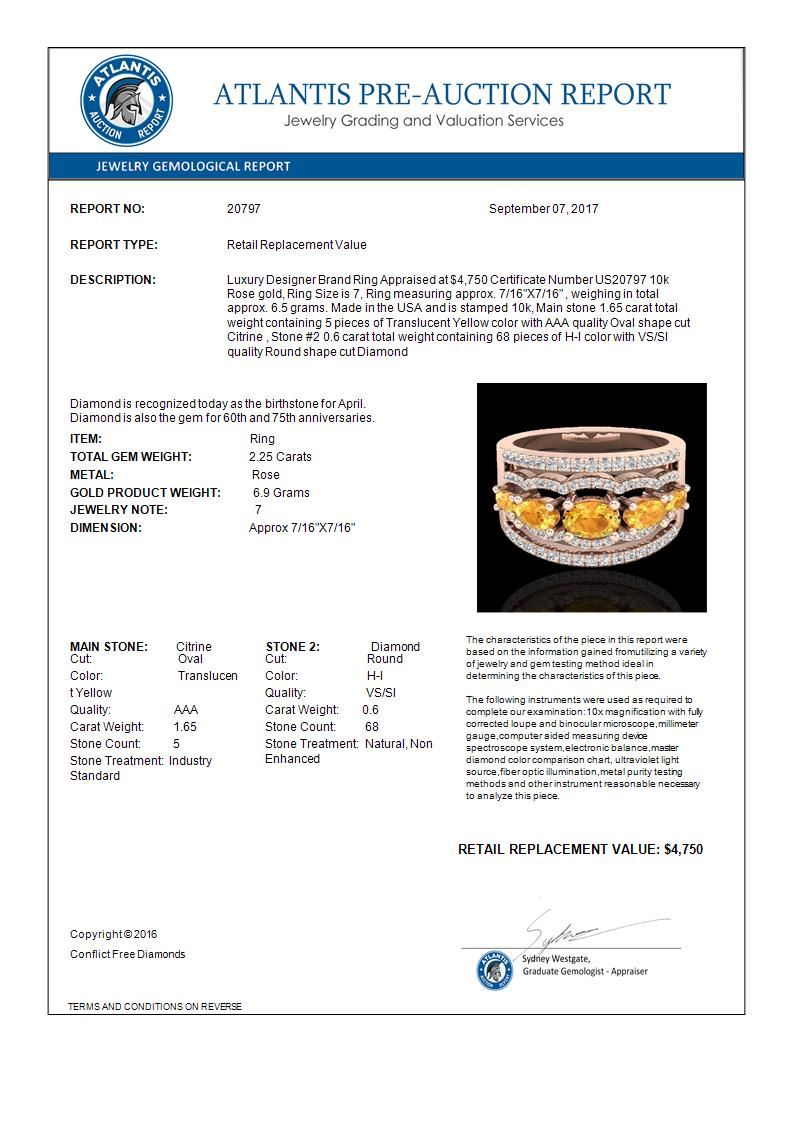 20797 - REF-71X8R ---- 2.25 CTW Citrine & Micro Pave VS/SI Diamond Certified Designer Ring 10K Rose Gold ---- Luxury Designer Brand Ring Appraised at $4,750 Certificate Number US20797 10k Rose gold, Ring Size is 7, Ring measuring approx. 7/16"X7/16" , weighing in total approx. 6.5 grams. Made in the USA and is stamped 10k, Main stone 1.65 carat total weight containing 5 pieces of Translucent Yellow color with AAA quality Oval shape cut Citrine , Stone #2 0.6 carat total weight containing 68 pieces of H-I color with VS/SI quality Round shape cut Diamond