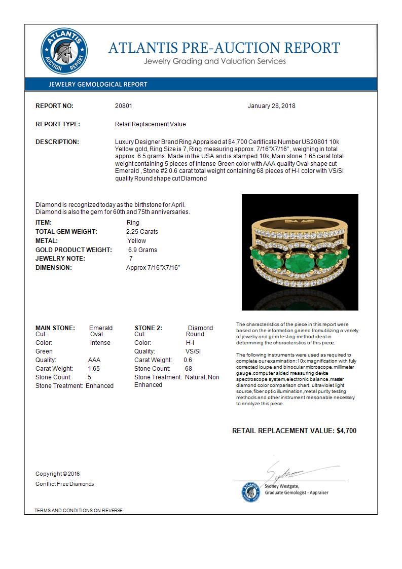 REF-71M3H -20801 ---- 2.25 CTW Emerald & Micro Pave VS/SI Diamond Designer Ring 10K Yellow Gold ---- Luxury Designer Brand Ring Appraised at $4,700 Certificate Number US20801 10k Yellow gold, Ring Size is 7, Ring measuring approx. 7/16"X7/16" , weighing in total approx. 6.5 grams. Made in the USA and is stamped 10k, Main stone 1.65 carat total weight containing 5 pieces of Intense Green color with AAA quality Oval shape cut Emerald , Stone #2 0.6 carat total weight containing 68 pieces of H-I color with VS/SI quality Round shape cut Diamond