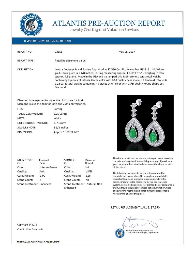 2.25 CTW Emerald & Micro Pave VS/SI Diamond Earrings Designer 14K White Gold ---- Luxury Designer Brand Earring Appraised Retail Price at $7,550 ---- SKU Number US23151 14k White gold Earring Size is 1 1/8 Inches, Earring measuring approx. 1 1/8" X 1/2" , weighing in total approx. 4.3 grams. Made in the USA and is stamped 14k, Main stone 1.00 carat total weight containing 2 pieces of Intense Green color with AAA quality Pear shape cut Emerald , Stone #2 1.25 carat total weight containing 48 pieces of H-I color with VS/SI quality Round shape cut