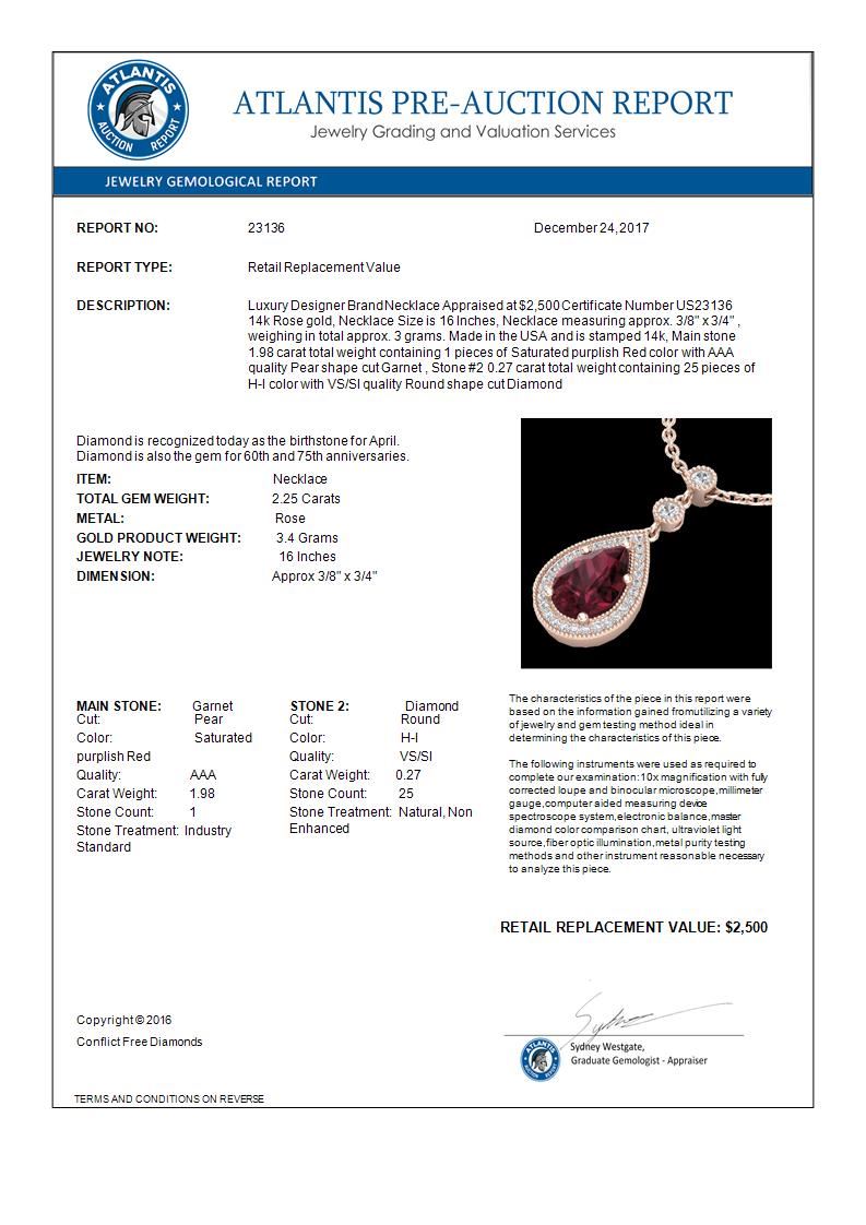 REF-40Y9K -23136 ---- 2.25 CTW Garnet & Micro VS/SI Diamond Necklace Designer 14K Rose Gold ---- Luxury Designer Brand Necklace Appraised at $2,500 Certificate Number US23136 14k Rose gold, Necklace Size is 16 Inches, Necklace measuring approx. 3/8" x 3/4" , weighing in total approx. 3 grams. Made in the USA and is stamped 14k, Main stone 1.98 carat total weight containing 1 pieces of Saturated purplish Red color with AAA quality Pear shape cut Garnet , Stone #2 0.27 carat total weight containing 25 pieces of H-I color with VS/SI quality Round shape cut Diamond