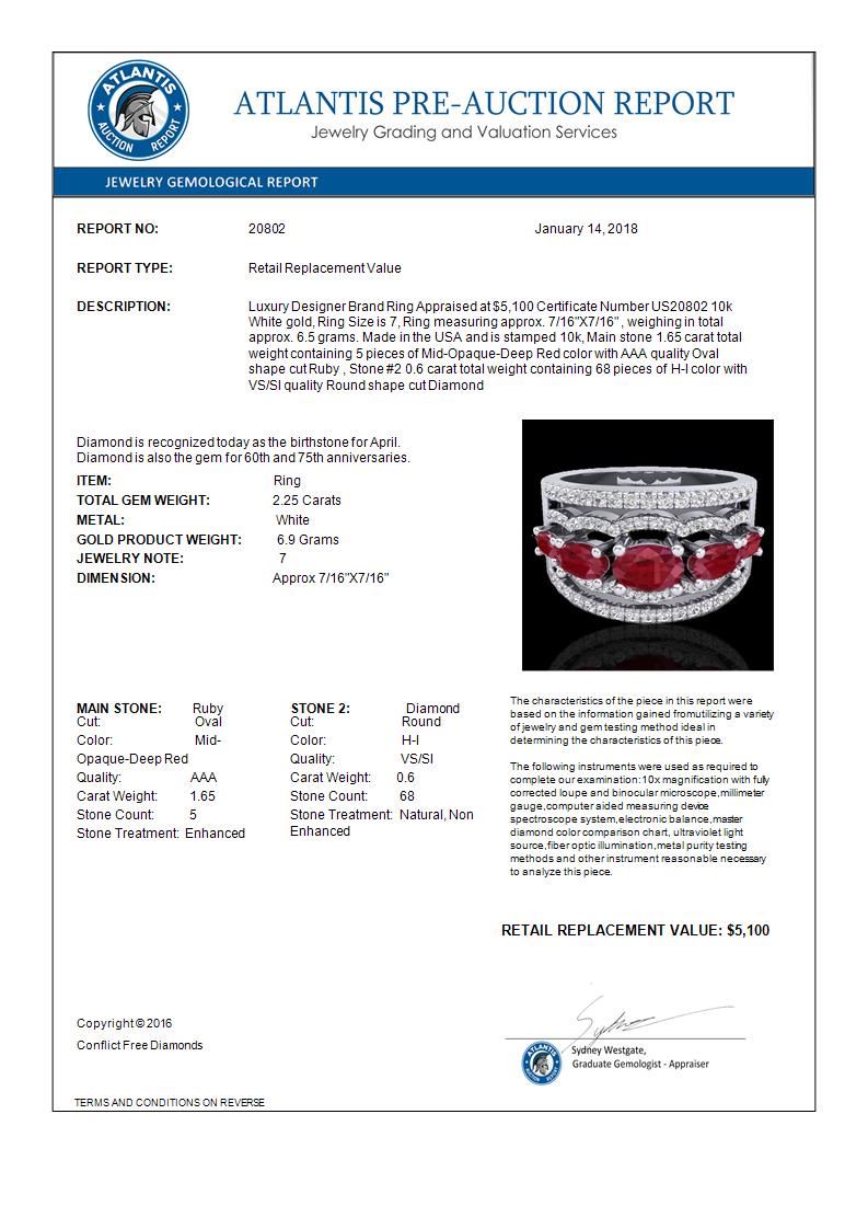 REF-71K3W -20802 ---- 2.25 CTW Ruby & Micro Pave VS/SI Diamond Designer Ring 10K White Gold ---- Luxury Designer Brand Ring Appraised at $5,100 Certificate Number US20802 10k White gold, Ring Size is 7, Ring measuring approx. 7/16"X7/16" , weighing in total approx. 6.5 grams. Made in the USA and is stamped 10k, Main stone 1.65 carat total weight containing 5 pieces of Mid-Opaque-Deep Red color with AAA quality Oval shape cut Ruby , Stone #2 0.6 carat total weight containing 68 pieces of H-I color with VS/SI quality Round shape cut Diamond