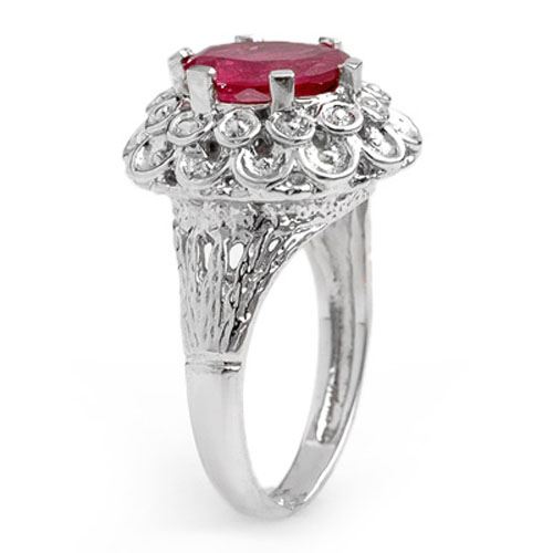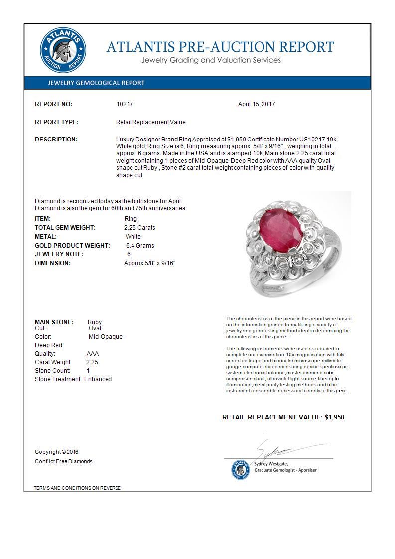 2.25 CTW Ruby Ring 10K White Gold ---- Luxury Designer Brand Ring Appraised Retail Price at $1,950 ---- SKU Number US10217 10k White gold Ring Size is 6, Ring measuring approx. 5/8" x 9/16" , weighing in total approx. 6 grams. Made in the USA and is stamped 10k, Main stone 2.25 carat total weight containing 1 pieces of Mid-Opaque-Deep Red color with AAA quality Oval shape cut Ruby , Stone #2 carat total weight containing pieces of color with quality shape cut