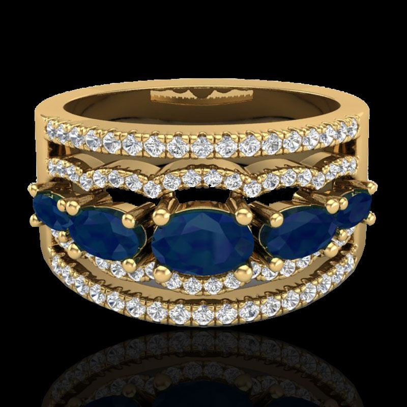REF-71H3A -20805 ---- 2.25 CTW Sapphire & Micro Pave VS/SI Diamond Designer Ring 10K Yellow Gold ---- Luxury Designer Brand Ring Appraised at $4,700 Certificate Number US20805 10k Yellow gold, Ring Size is 7, Ring measuring approx. 7/16"X7/16" , weighing in total approx. 6.5 grams. Made in the USA and is stamped 10k, Main stone 1.65 carat total weight containing 5 pieces of Mid-Opaque-Deep Blue color with AAA quality Oval shape cut Sapphire , Stone #2 0.6 carat total weight containing 68 pieces of H-I color with VS/SI quality Round shape cut Diamond