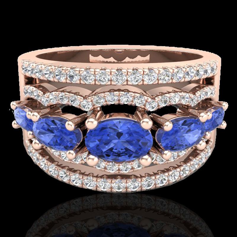 REF-80K2W -20806 ---- 2.25 CTW Tanzanite & Micro Pave VS/SI Diamond Designer Ring 10K Rose Gold ---- Luxury Designer Brand Ring Appraised at $5,700 Certificate Number US20806 10k Rose gold, Ring Size is 7, Ring measuring approx. 7/16"X7/16" , weighing in total approx. 6.5 grams. Made in the USA and is stamped 10k, Main stone 1.65 carat total weight containing 5 pieces of Intense Violet Blue color with AAA quality Oval shape cut Tanzanite , Stone #2 0.6 carat total weight containing 68 pieces of H-I color with VS/SI quality Round shape cut Diamond
