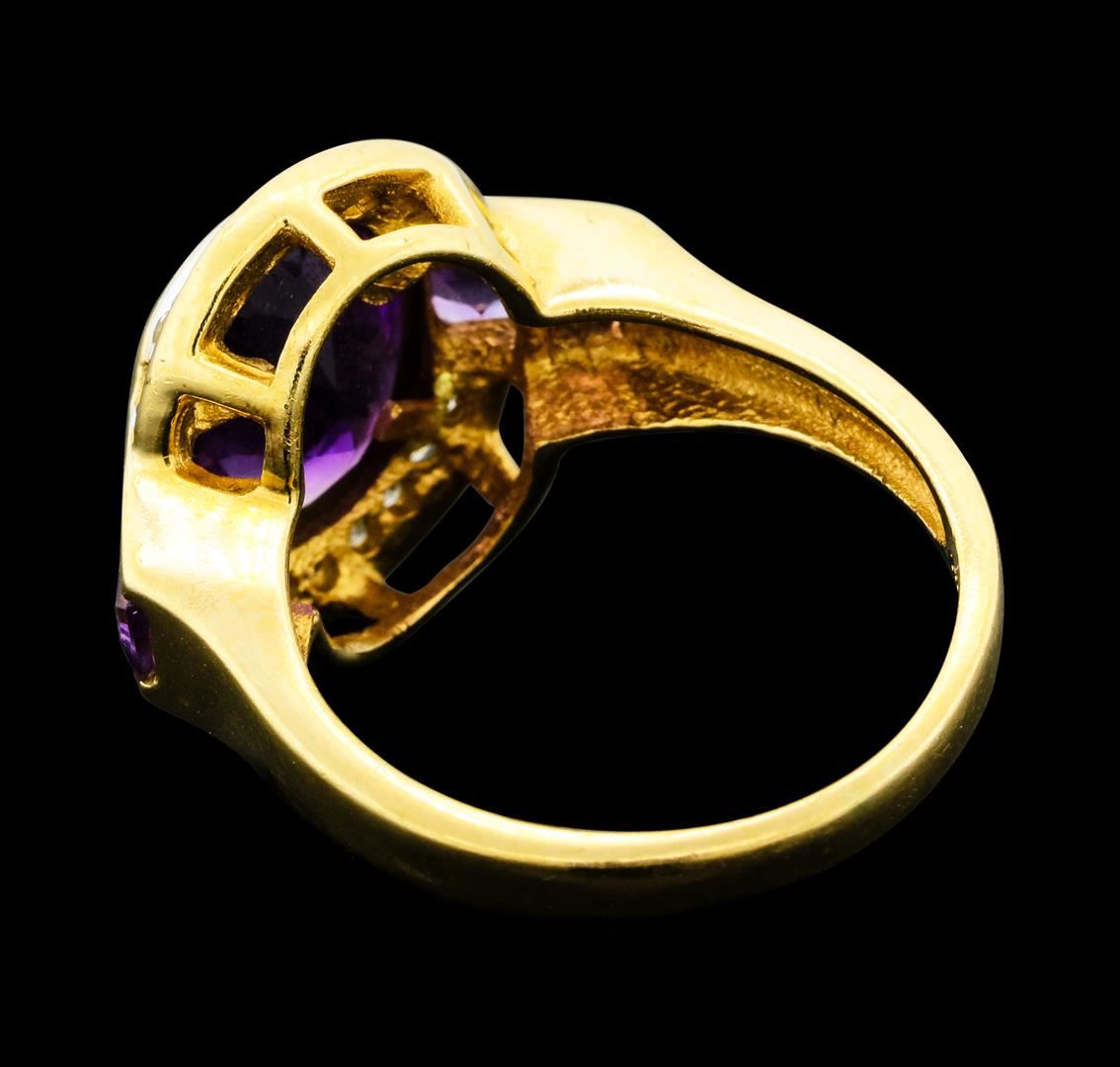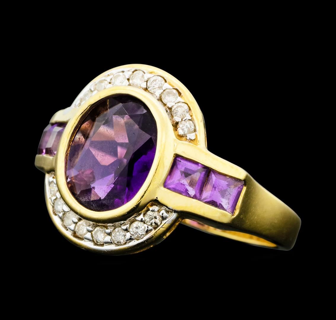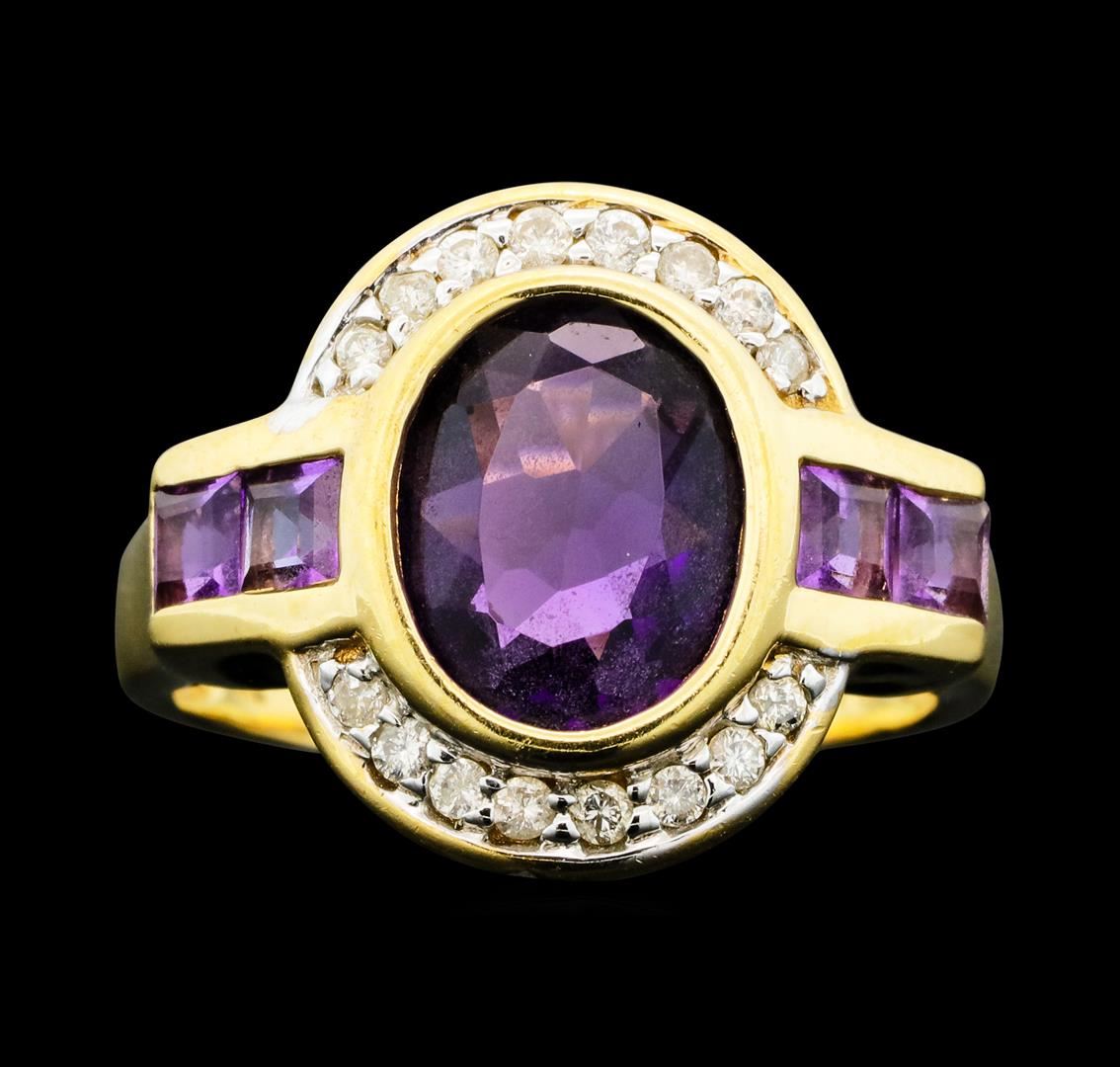 One electronically tested 14KT yellow gold lady's cast fashion ring with a cathedral halo with a bright polish finish. The featured lady's ring has a shank measuring 2.15 millimeters wide. Identified with markings of '14K'. Condition is used, good workmanship. Containing: One prong set oval modified brilliant cut natural amethyst, measuring 9.60 x 7.50 x 3.86mm, (depth est.) 5%. bulge factor, approximate weight of 1.63ct., clarity is eye clean, medium, moderately strong, purple color, (GIA P 5/4), cut is very good. Transmitting light with no distortion, transparent. Colored gemstones are presumed to have been subjected to commonly used enhancement processes. Graded in the setting. Four channel set square standard step cut natural amethysts, measuring 3.00 x 2.85 x 1.91mm, (depth est.) approximate total weight of 0.44ct., clarity is eye clean, light, moderately strong, purple color, (GIA P 3/4), cut is good. Transmitting light with no distortion, transparent. Colored gemstones are presumed to have been subjected to commonly used enhancement processes. Graded in the setting. Sixteen prong set round brilliant cut diamonds, measuring 1.50 - 1.40 x 0.90mm (depth est.) approximate total weight of 16 Stones = 0.18ct. Graded in the setting. Color I - J Clarity SI-2 to I-1 Cut Good. Total Weight of Colored Stones 2.07ct.. Total Weight of Diamonds 0.18ct.. Total Weight of Ring 4.70gm. GAS Appraised at $1,205.00.