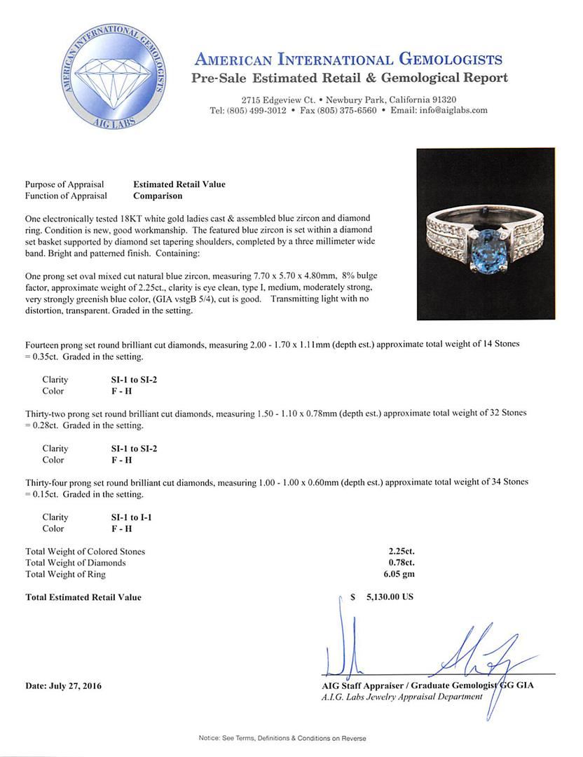 One electronically tested 18KT white gold ladies cast & assembled blue zircon and diamond ring. The featured blue zircon is set within a diamond set basket supported by diamond set tapering shoulders, completed by a three millimeter wide band. Bright and patterned finish. Condition is new, good workmanship. Containing: One prong set oval mixed cut natural blue zircon, measuring 7.70 x 5.70 x 4.80mm, 8%. bulge factor, approximate weight of 2.25ct., clarity is eye clean, type I, medium, moderately strong, very strongly greenish blue color, (GIA vstgB 5/4), cut is good. Transmitting light with no distortion, transparent. Graded in the setting. Fourteen prong set round brilliant cut diamonds, measuring 2.00 - 1.70 x 1.11mm (depth est.) approximate total weight of 14 Stones = 0.35ct. Graded in the setting. Clarity SI-1 to SI-2. Color: F - H Thirty-Two prong set round brilliant cut diamonds, measuring 1.50 - 1.10 x 0.78mm (depth est.) approximate total weight of 32 Stones = 0.28ct. Graded in the setting. Clarity SI-1 to SI-2. Color: F - H Thirty-Four prong set round brilliant cut diamonds, measuring 1.00 - 1.00 x 0.60mm (depth est.) approximate total weight of 34 Stones = 0.15ct. Graded in the setting. Clarity SI-1 to I-1. Color: F - H. Total Weight of Colored Stones 2.25ct.. Total Weight of Diamonds 0.78ct.. Total Weight of Ring 6.05gm. AIG Appraised at $5,130.00.
