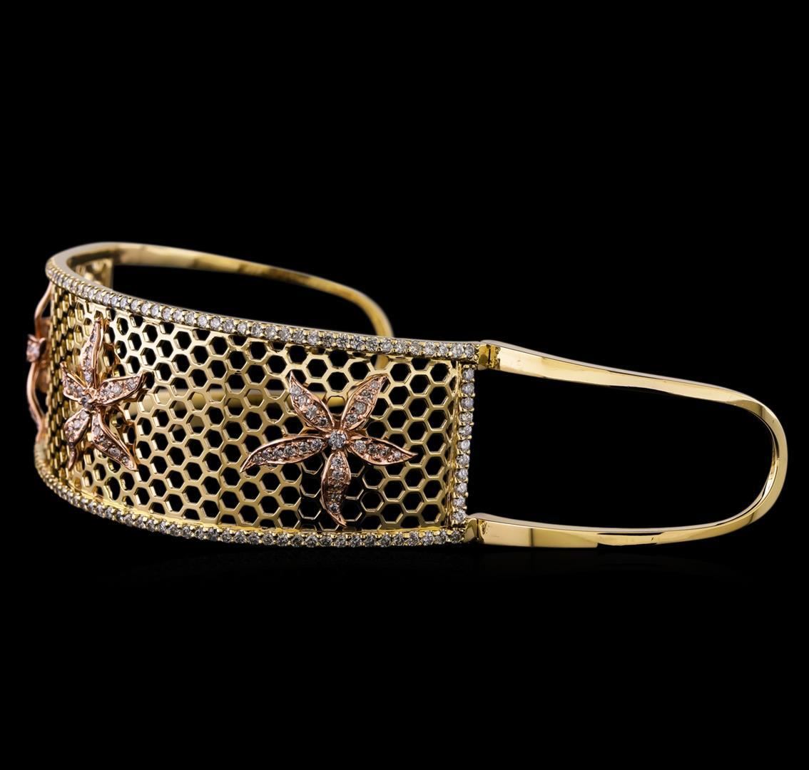 One electronically tested 14KT yellow and rose gold lady's combination cast & assembled fashion cuff bracelet with a bright polish finish. The featured lady's bracelet has a length of approximately 7 inches. Identified with markings of "K14". Condition is new, good workmanship. Containing: One Hundred Thirty-Seven prong set round brilliant cut diamonds, measuring 1.50 - 1.40 x 0.90mm (depth est.) approximate total weight of 137 Stones = 1.60ct. Graded in the setting. Clarity: SI-1 to SI-2. Color: H - I. Cut Good Sixty-Nine prong set round brilliant cut diamonds, measuring 1.40 - 1.30 x 0.84mm (depth est.) approximate total weight of 69 Stones = 0.65ct. Graded in the setting. Clarity: SI-1 to SI-2. Color: H - I. Cut Good. Total Weight of Diamonds 2.25ct. Total Weight of Cuff Bracelet 22.20gm. GAS Appraised.